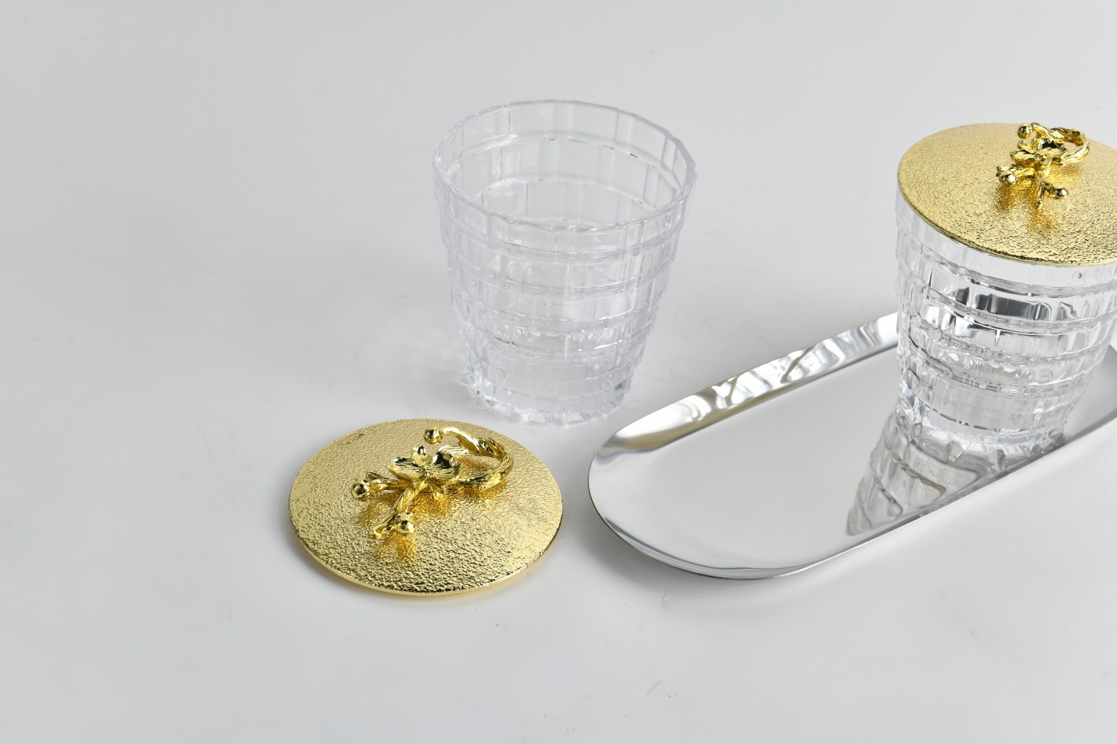 Design Highlights: Golden sculptural lid details paired with a mirrored tray for an elevated aesthetic