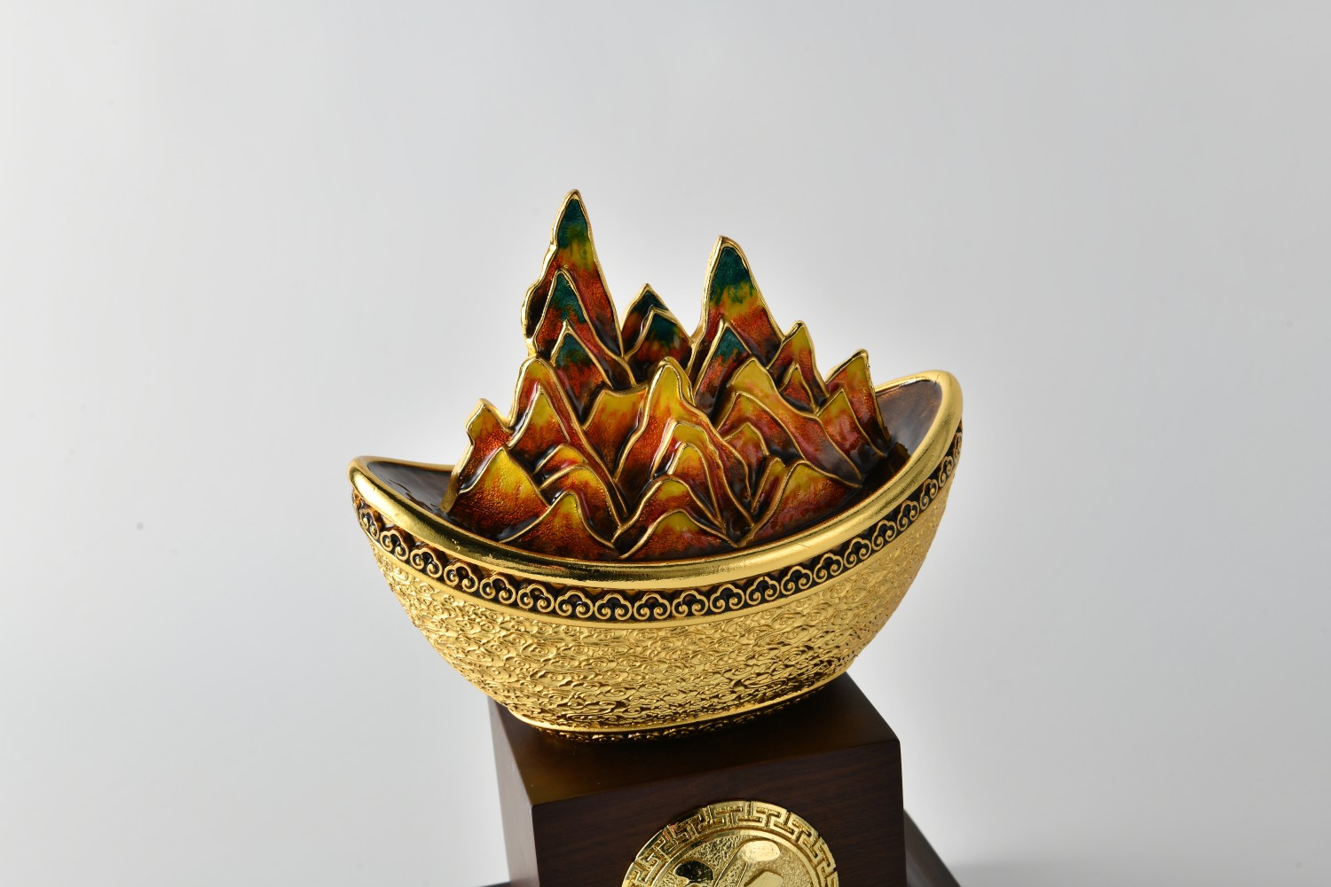 A perfect fusion of traditional symbolism and modern artistry, this Treasure Bowl Ornament features a gold-finished basin with intricate engravings, radiating an aura of luxury and wealth. Inside, layered mountain-like formations symbolize continuous fortune and abundance. The piece is enhanced by a vibrant glazed finish, adding depth and dimension to its striking silhouette. At the base, a gold-plated plaque with the Chinese character “福” (fortune) reinforces its auspicious significance. Ideal as a home décor piece or a meaningful gift, this ornament is perfect for family, friends, and business partners alike.