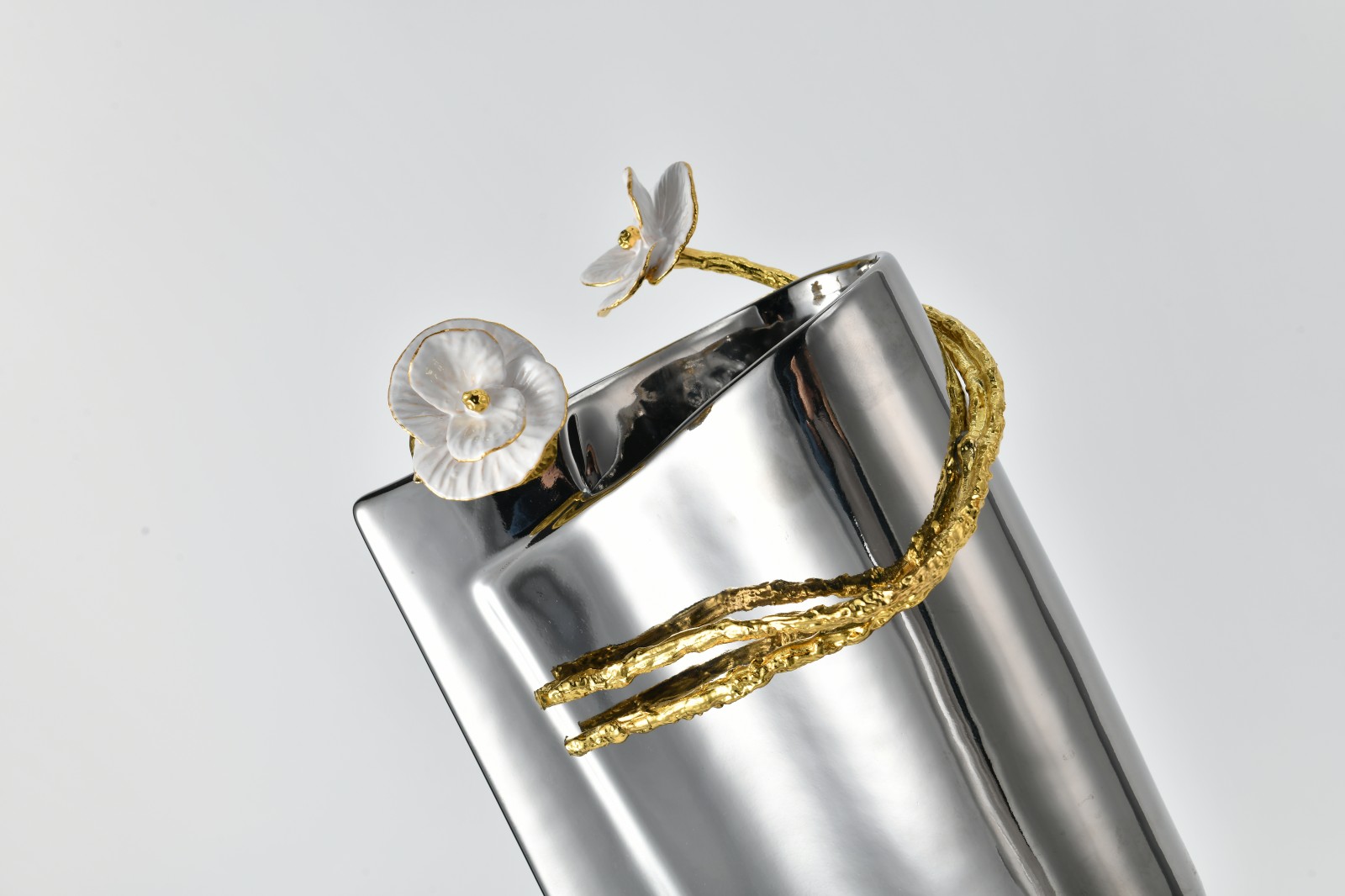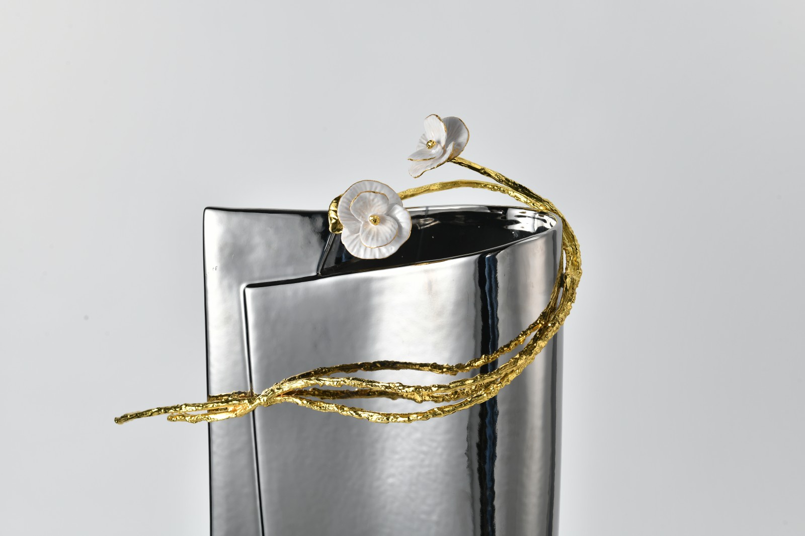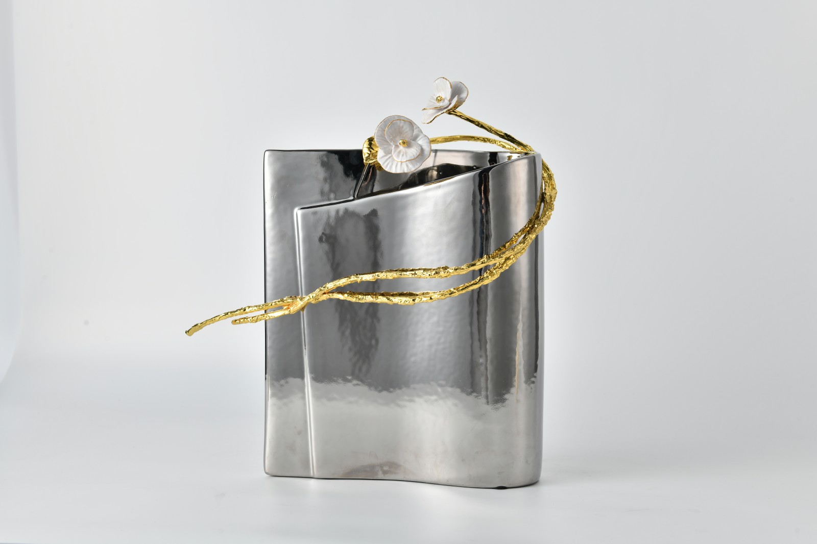 Adorned with golden vines and delicate white blossoms, the vases soften the cool metallic sheen with warmth and poetry, creating an arresting focal point within any space.