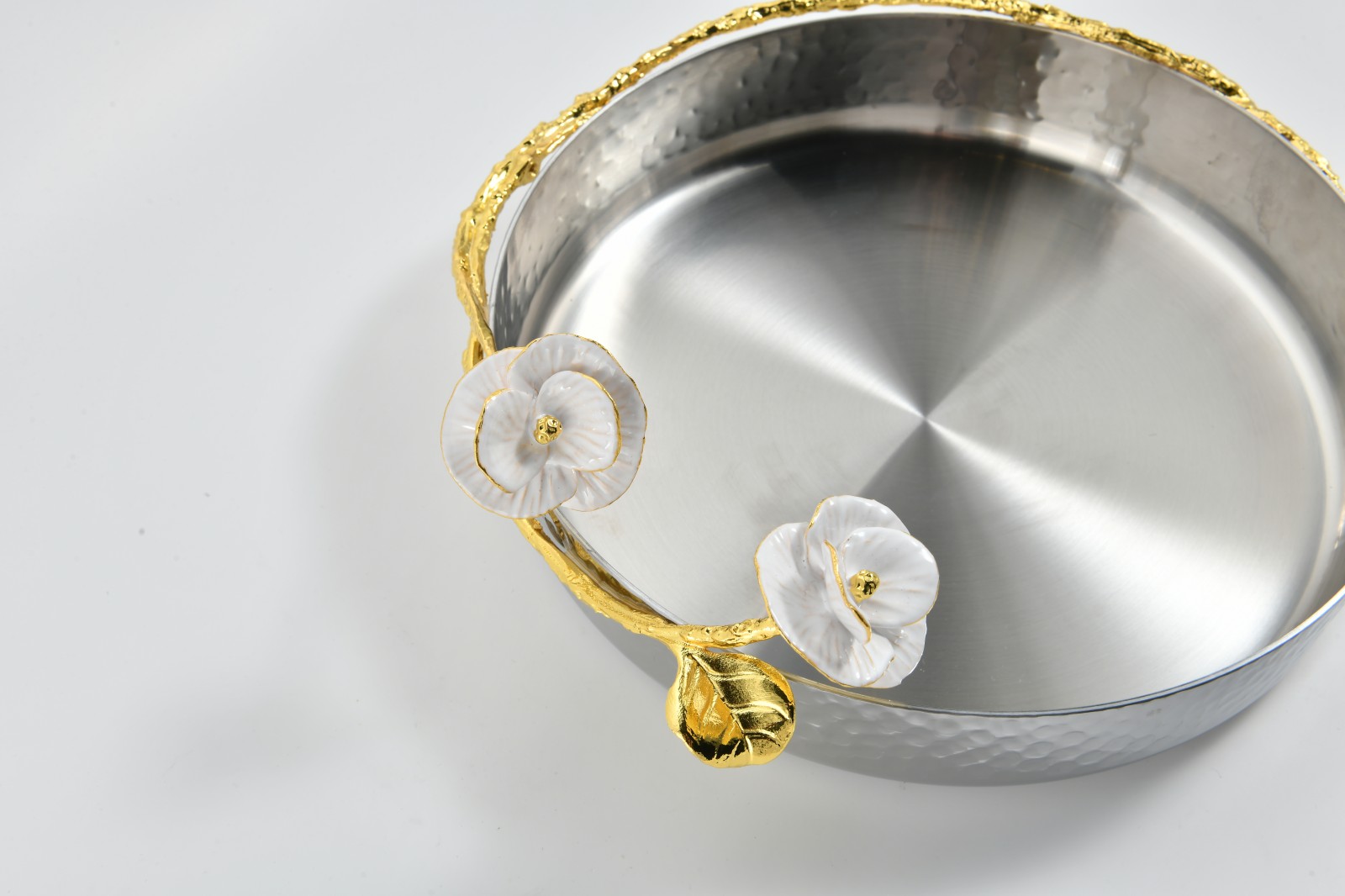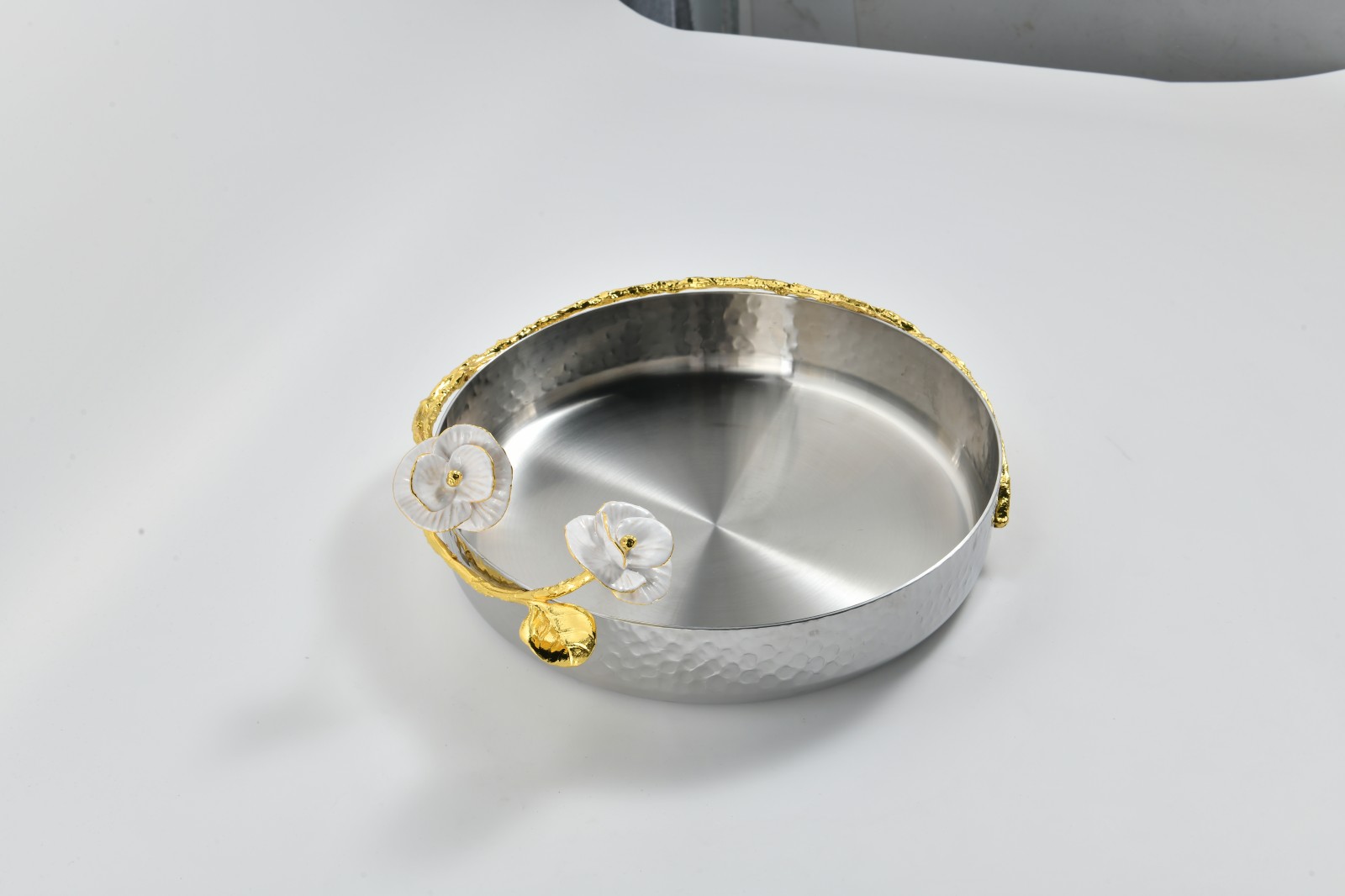 This fruit plate combines mirror polishing with hand-hammered craftsmanship, achieving a tactile balance between smoothness and texture. The rim extends naturally into golden branches, intertwined with two porcelain-white flowers — a delicate detail symbolizing nature’s rebirth within metal.