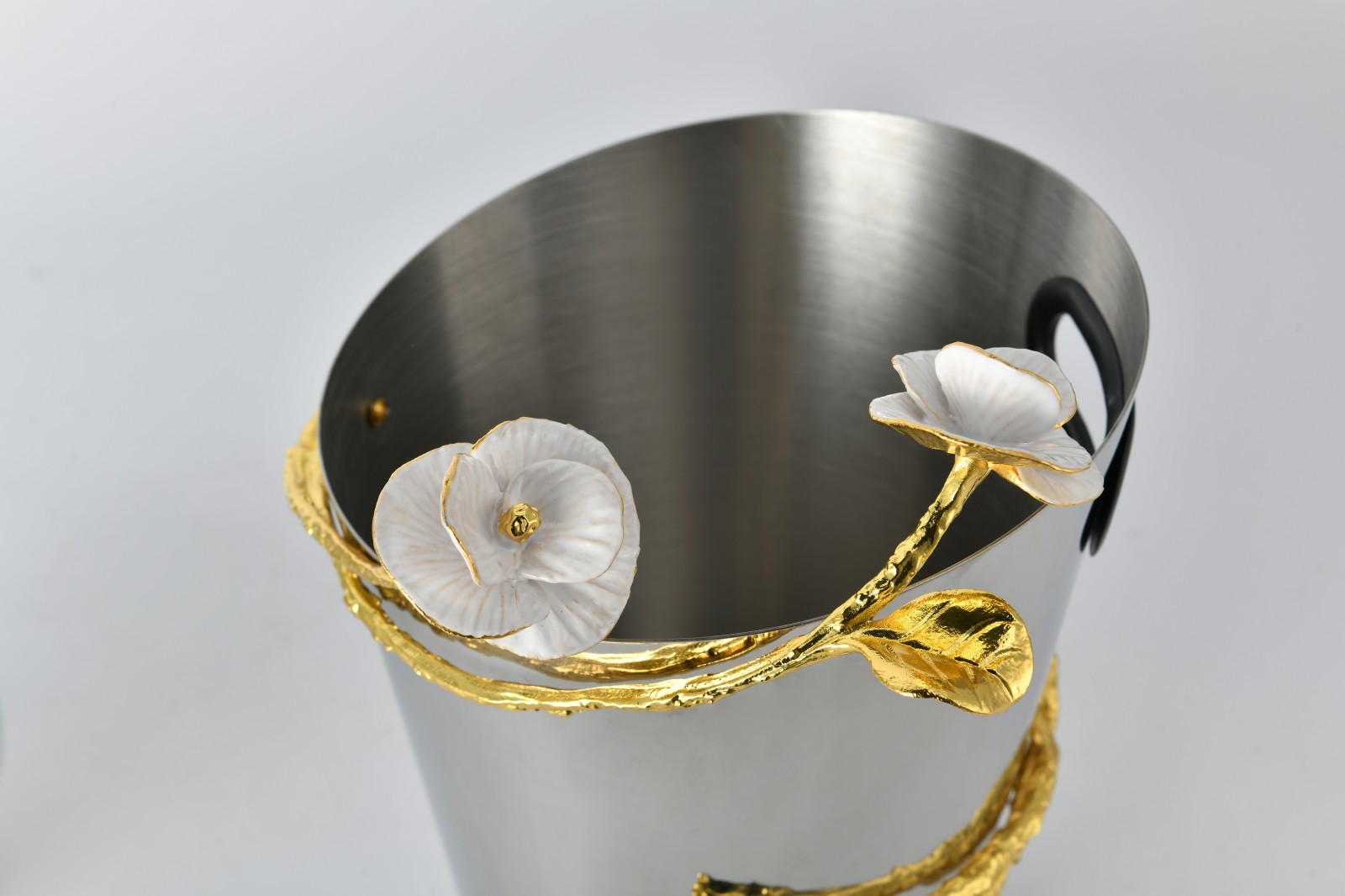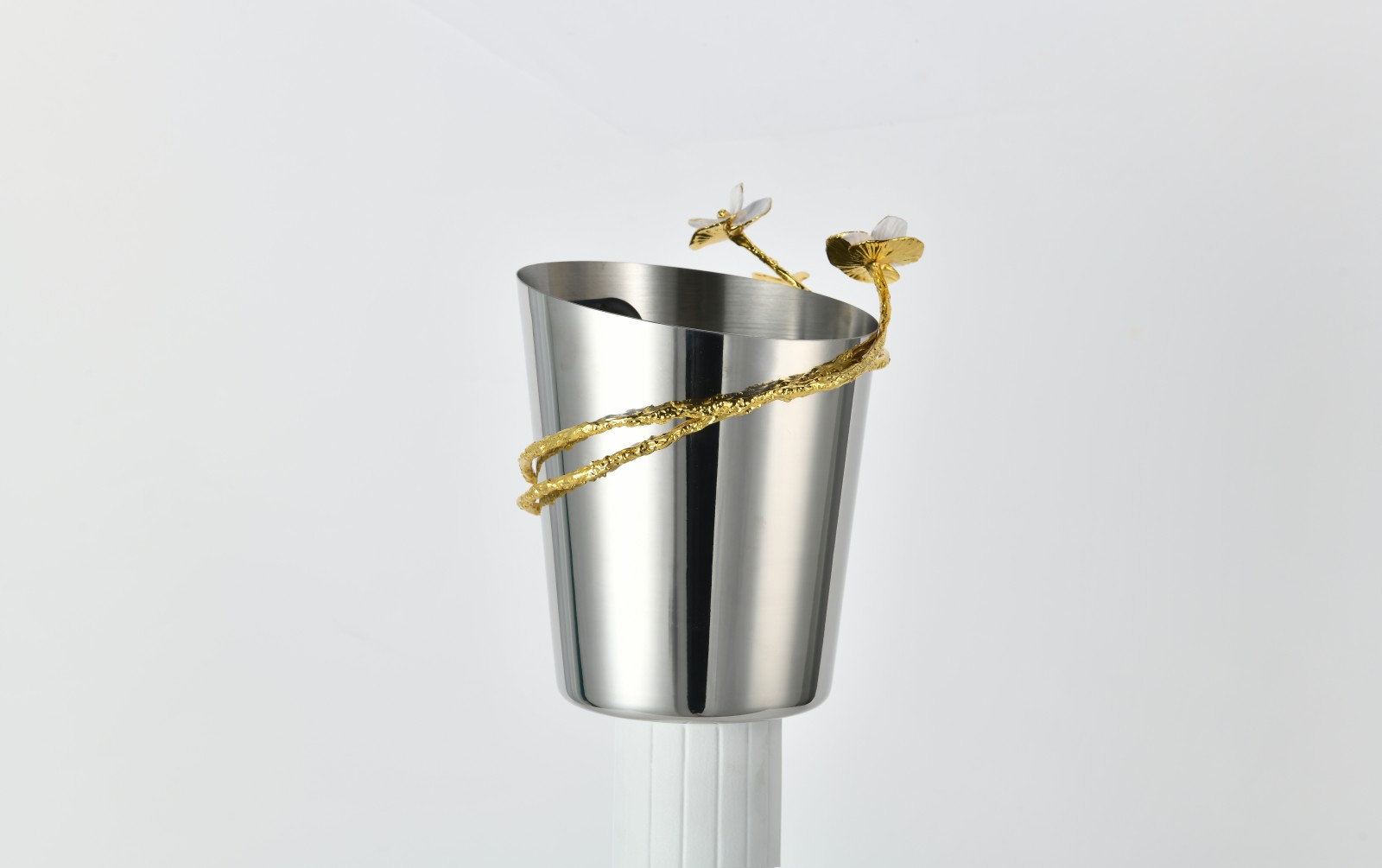 With its clean cup-shaped design and brushed finish, this stainless steel ice bucket strikes the perfect balance between function and beauty. Golden vines gently wrap around the surface while white blossoms bloom gracefully — as if flowers emerge from frost — bringing a touch of softness to the cool metal texture.
