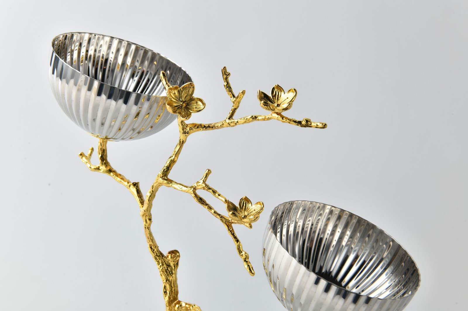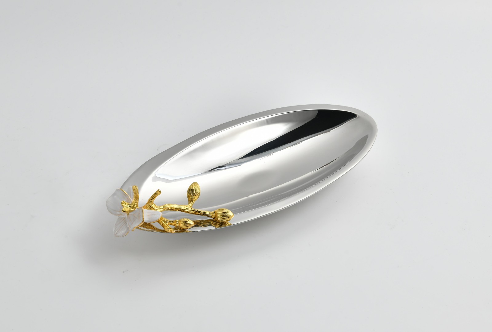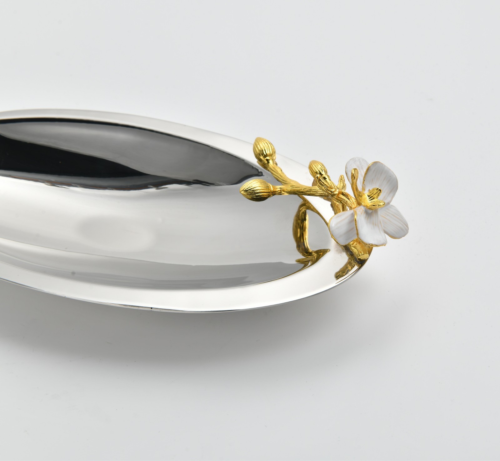 This silver stainless steel fruit dish interprets modern minimalism with its smooth oval shape. The mirror stainless steel material reflects a cold and high-end luster, and the white flowers and golden branch decorations at the edge subtly embed natural vitality into the modern design context.