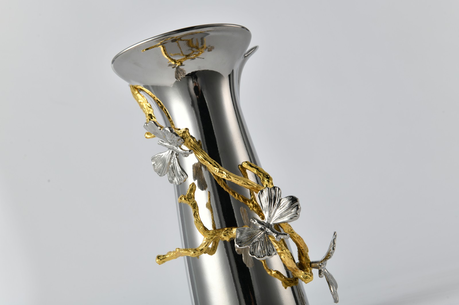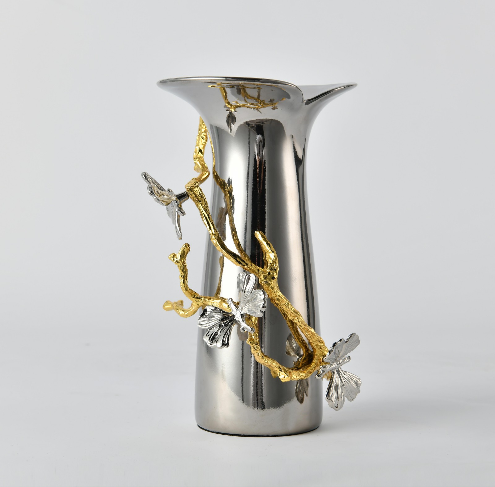This silver ceramic vase showcases the personality of modern art home decor with its sculptural shape. The silver ceramic body has a cold luster, and golden branches are intertwined with silver ginkgo leaves and dragonfly decorations. In the collision of materials and colors, the agility of natural life is frozen.