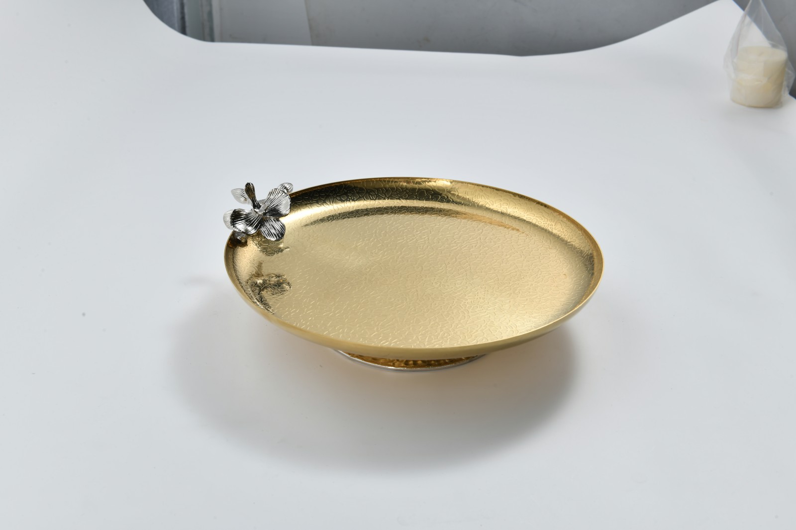 The golden trays are supported by a silver branch-inspired column, forming a striking interplay of metallic tones.