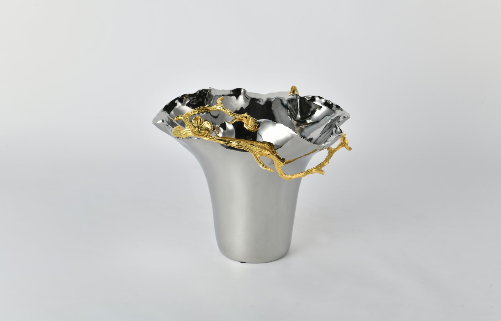The handcrafted golden branches and delicate floral details entwining the vase introduce warmth and organic vitality to the cool metallic sheen.