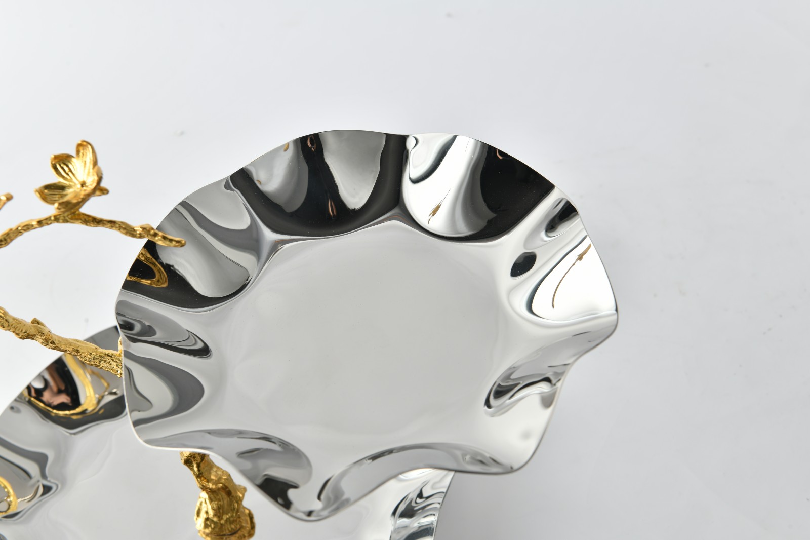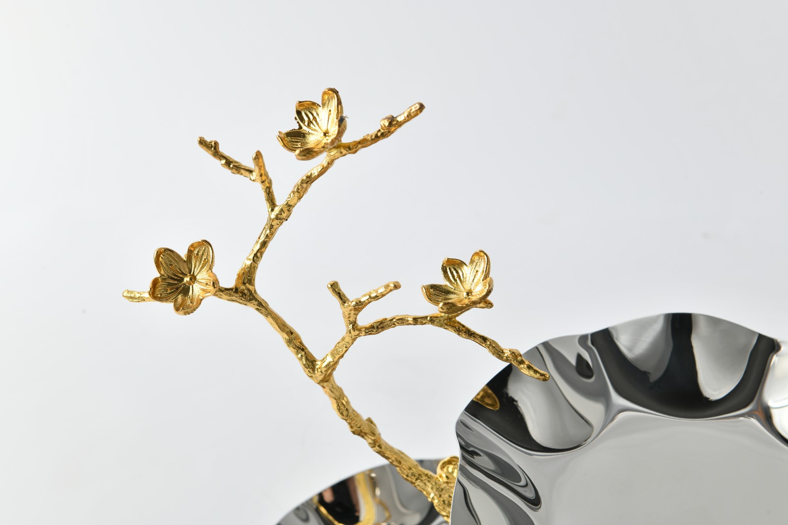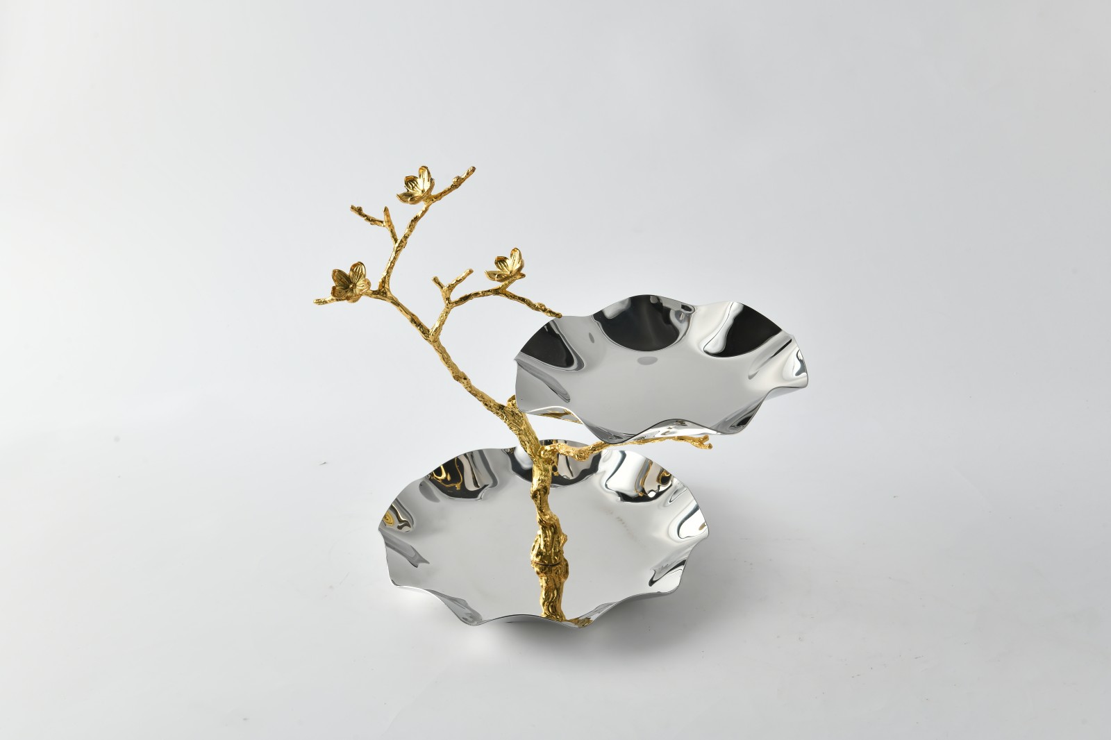 Supported by a golden branch structure and paired with dual silver stainless-steel trays, this two-tier fruit stand redefines the boundary between utility and art.