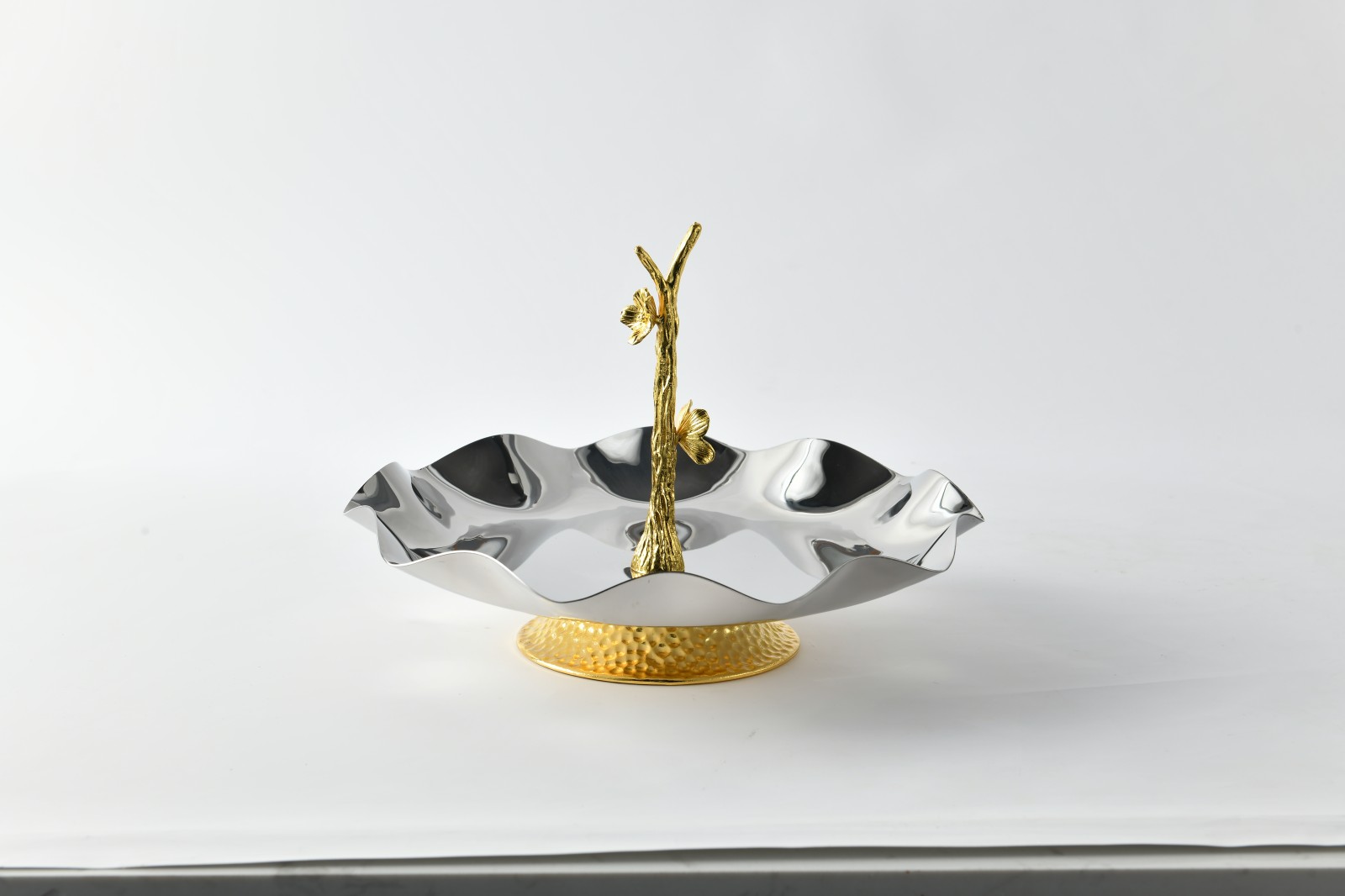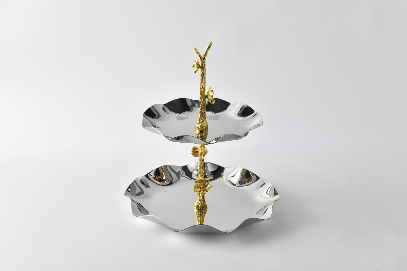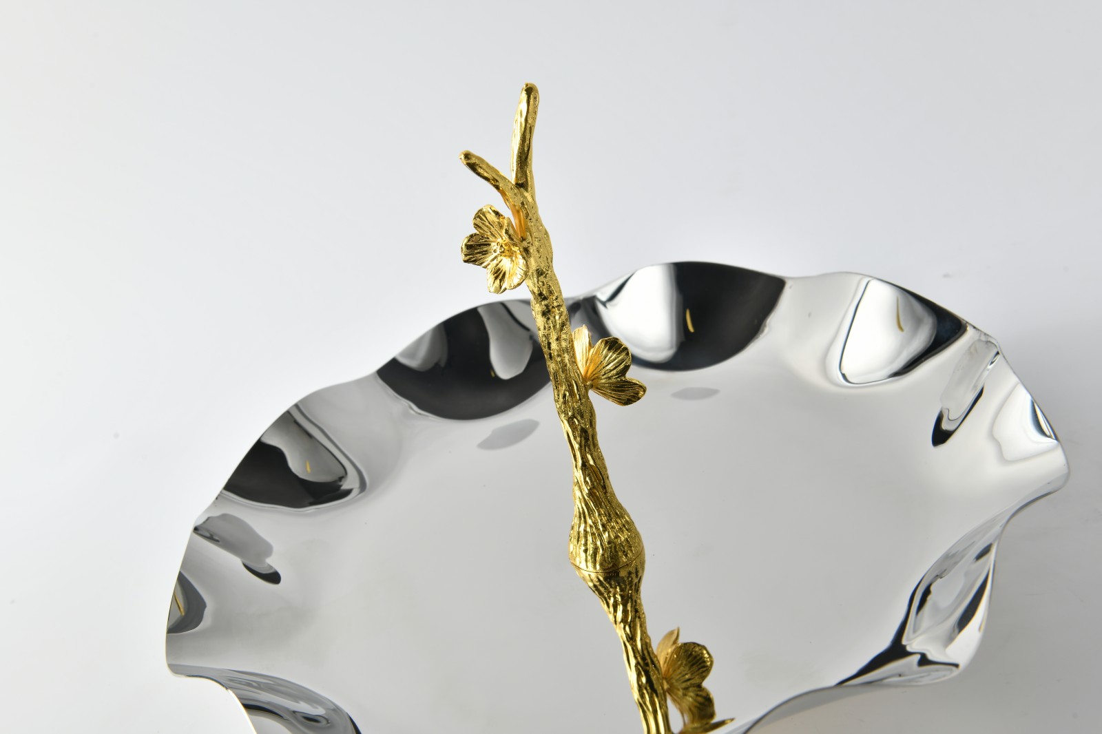 Supported by a golden branch structure and paired with dual silver stainless-steel trays, this two-tier fruit stand redefines the boundary between utility and art.