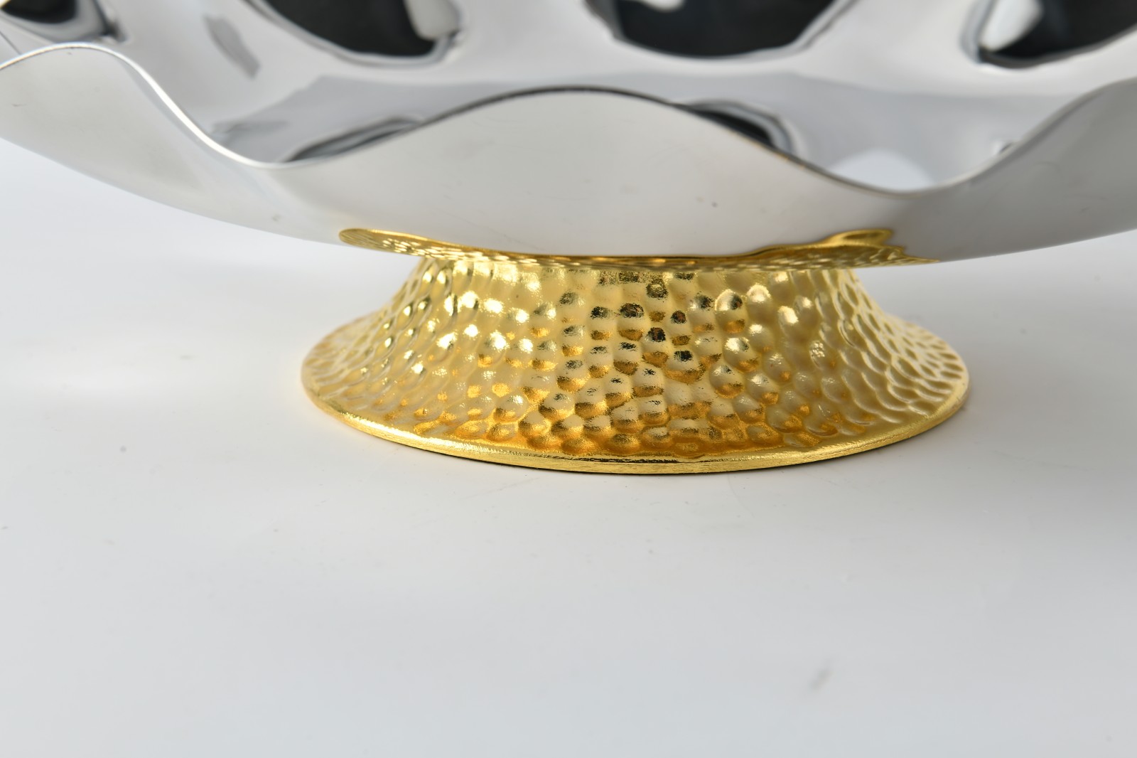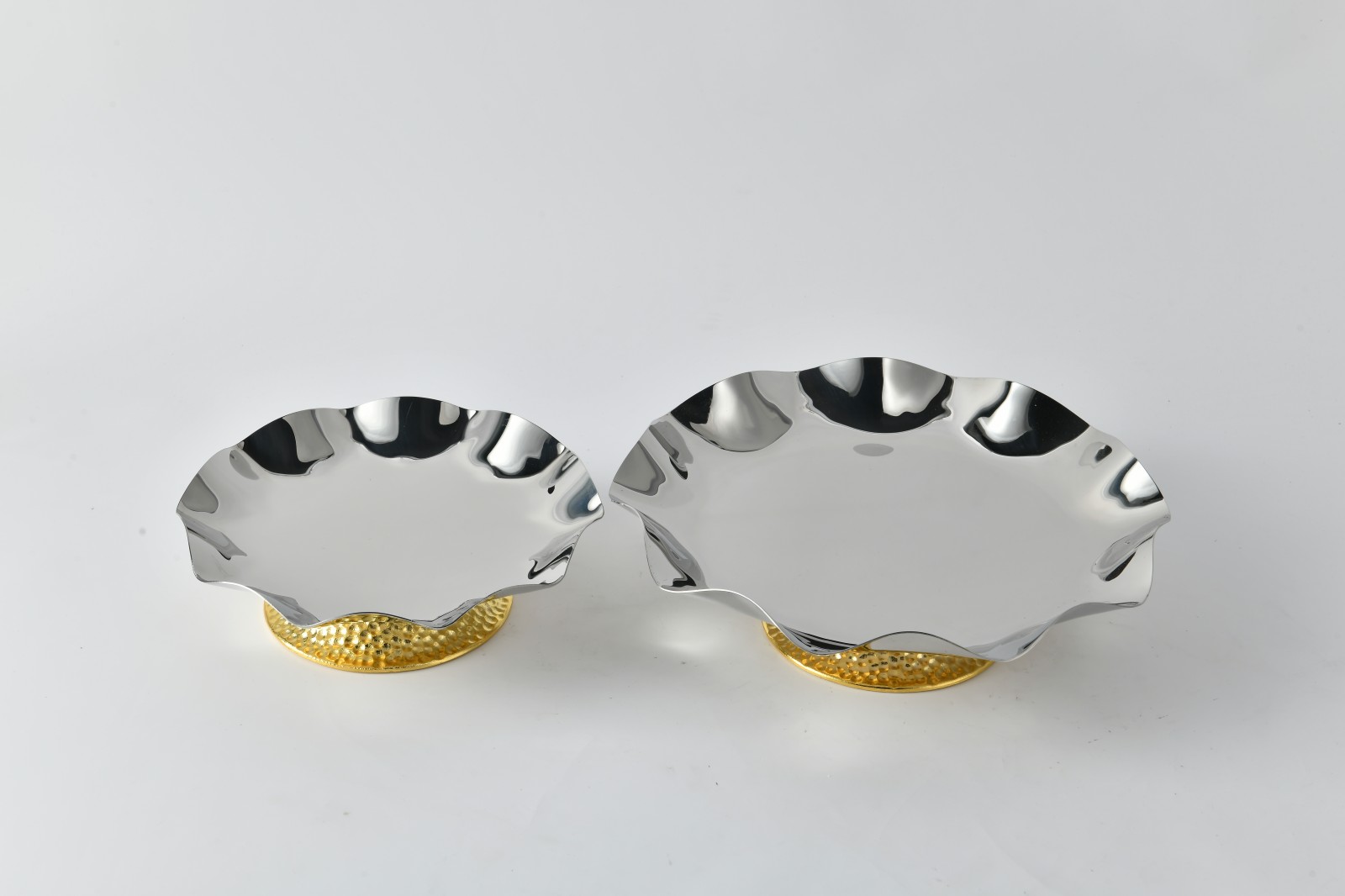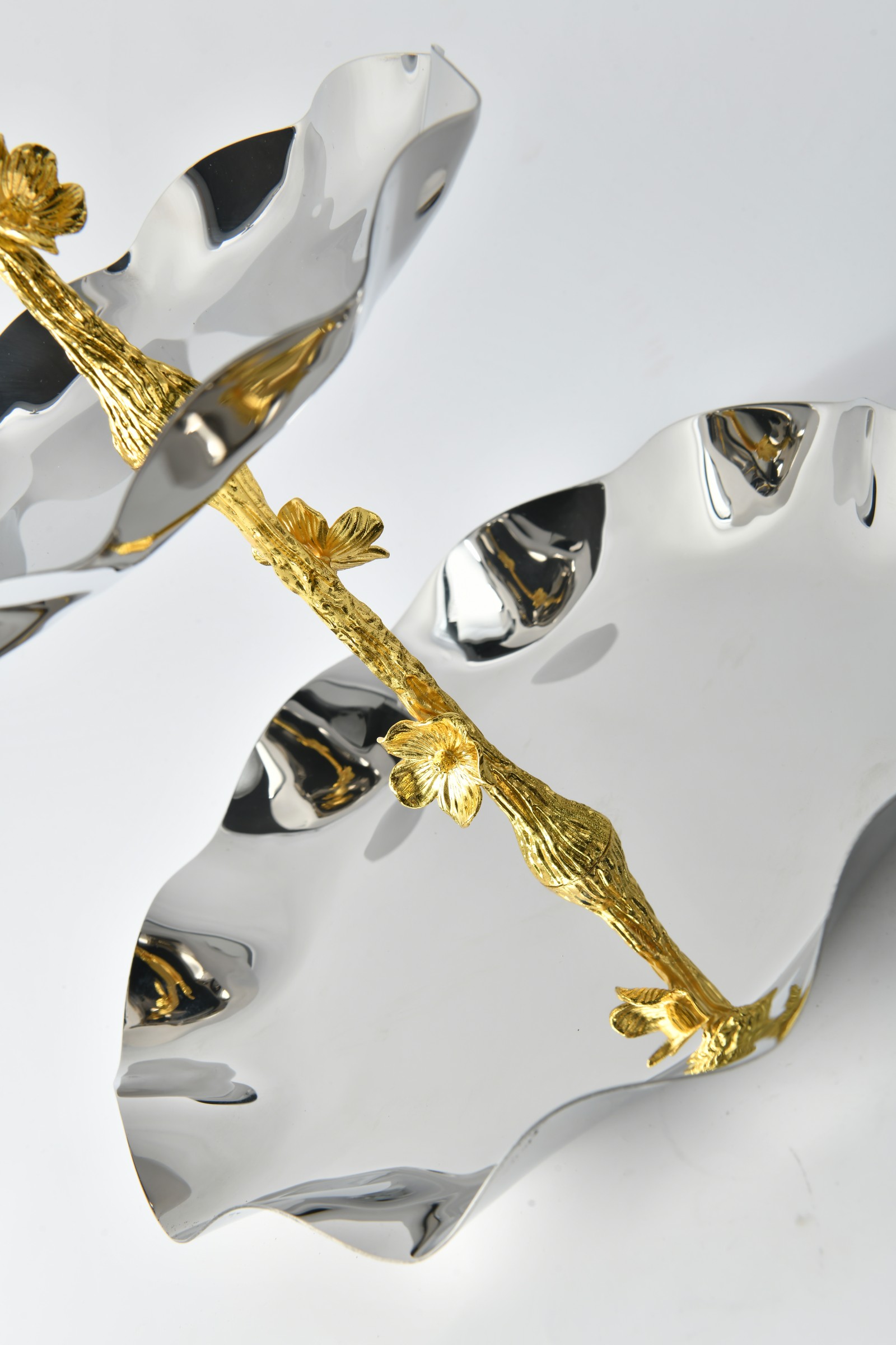 This three-piece fruit bowl set features petal-shaped trays in polished silver stainless steel, complemented by gold-hammered bases for a sophisticated, tactile appeal.