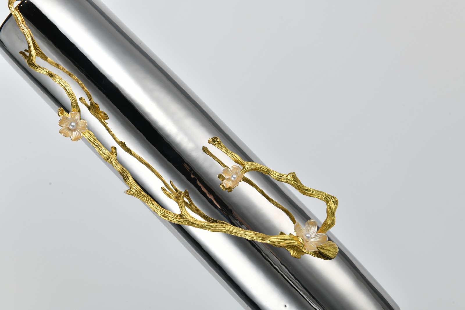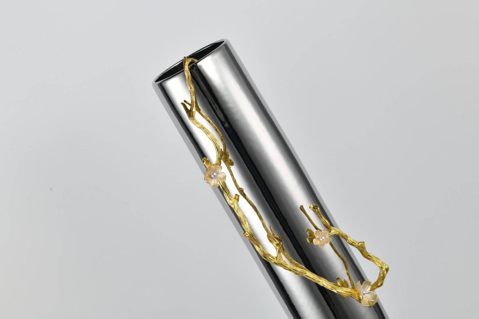 The hand-sculpted golden branch motif entwining the body serves as a stunning highlight — its organic texture and delicate blossoms bring nature’s vitality into a setting of quiet opulence.