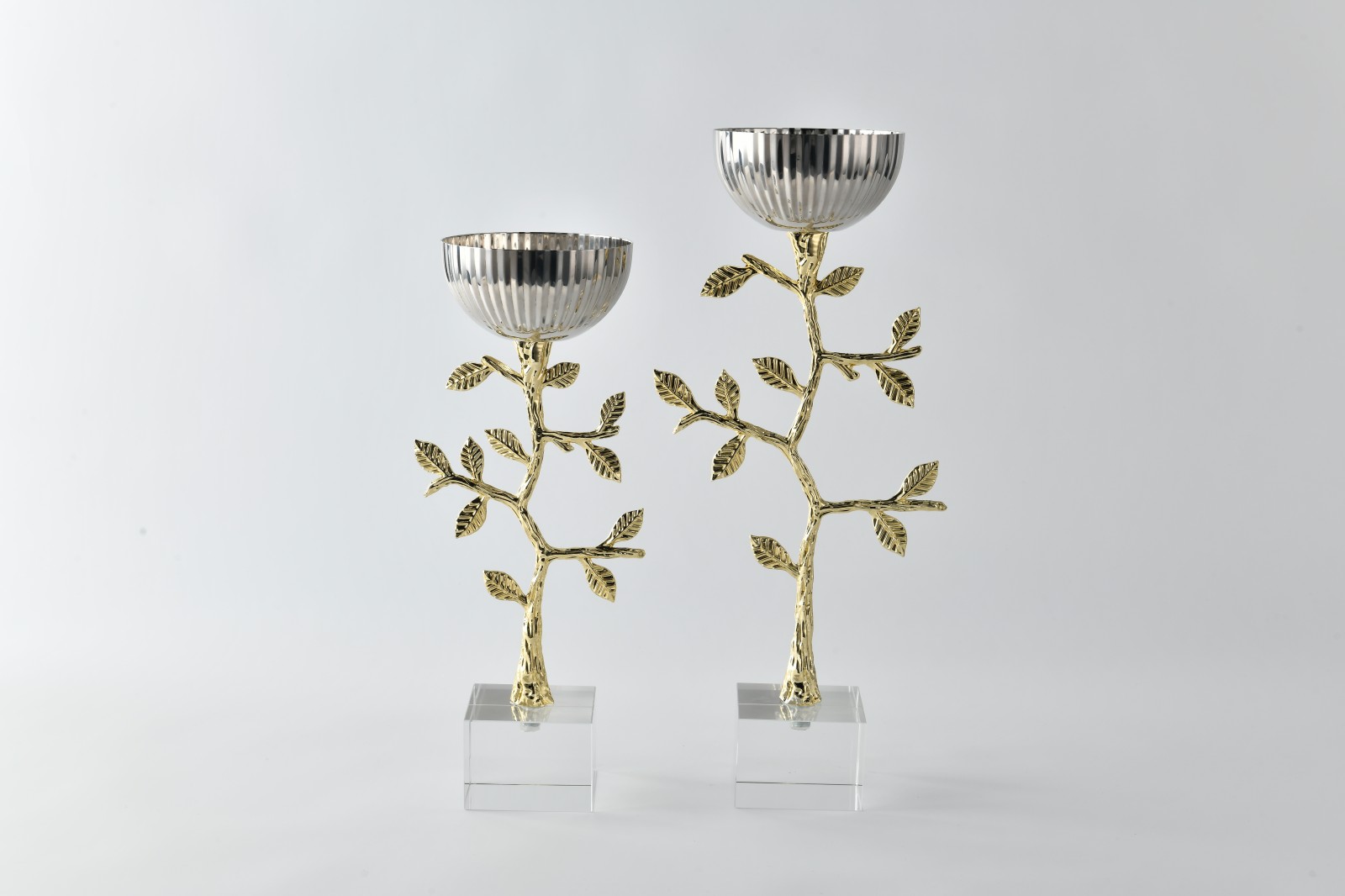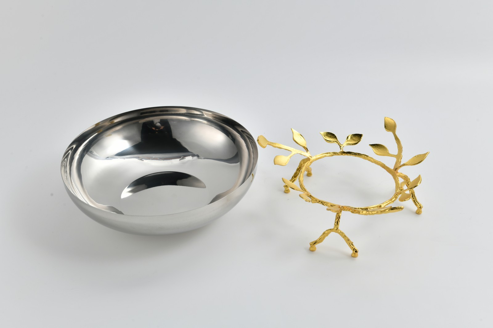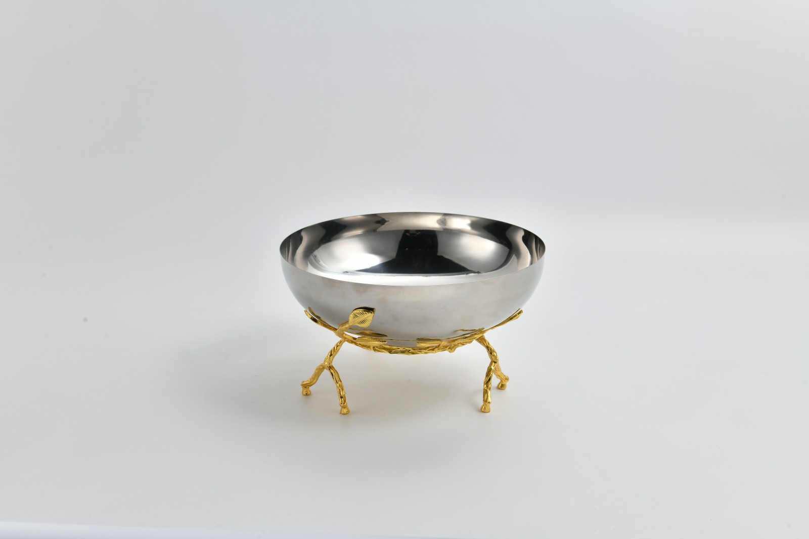 This pair of stainless-steel fruit bowls features a mirror-polished silver body paired with golden branch-style bases, forming a bold yet harmonious gold–silver contrast.
