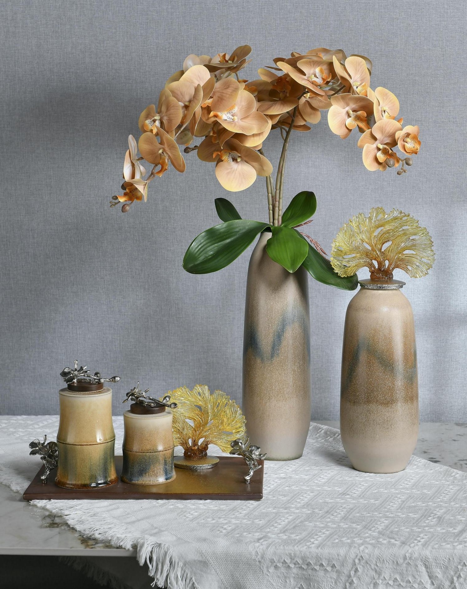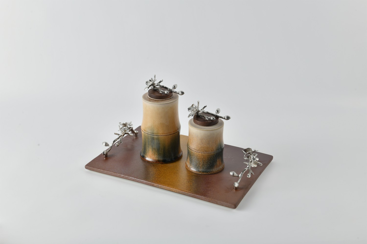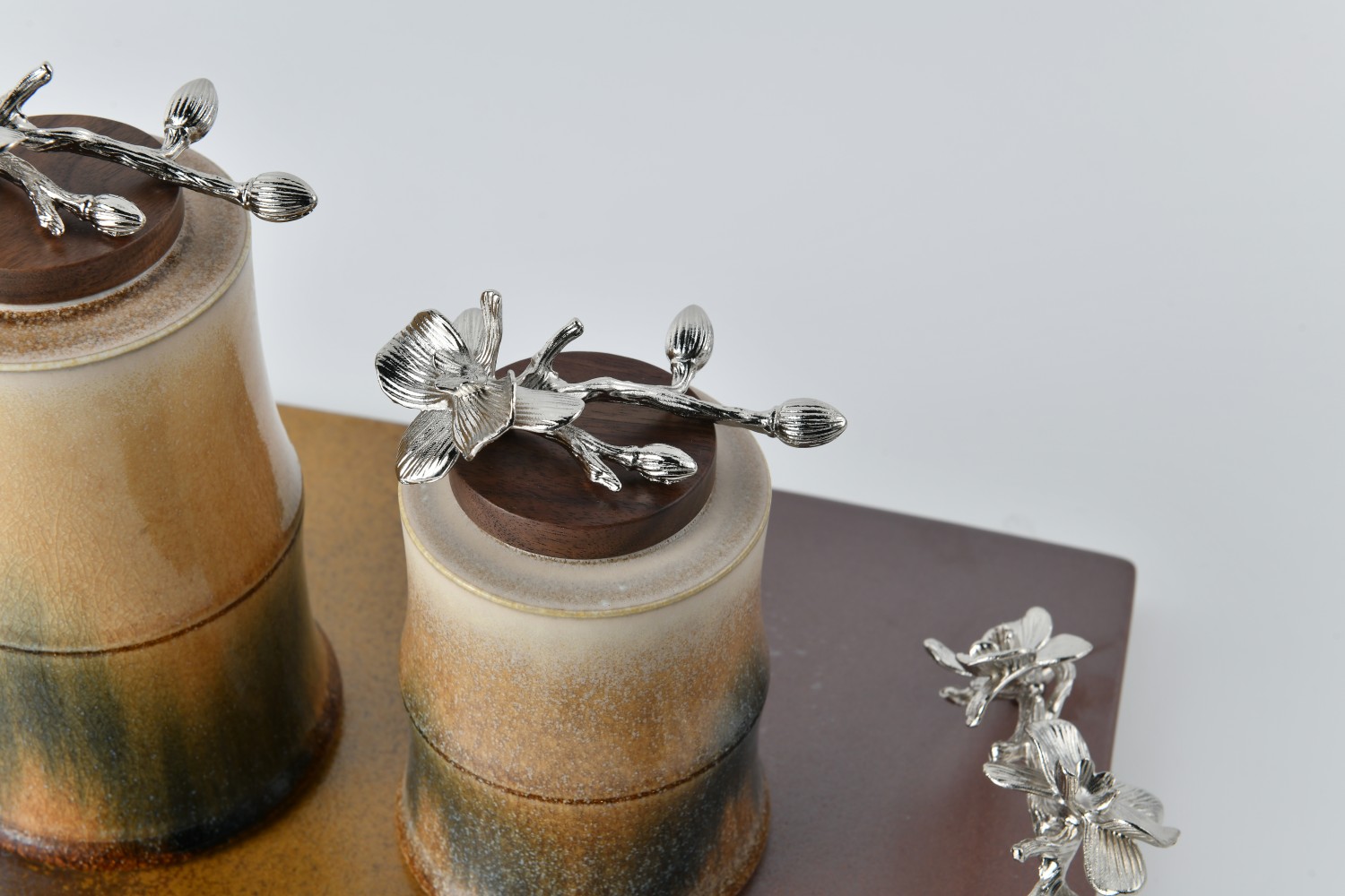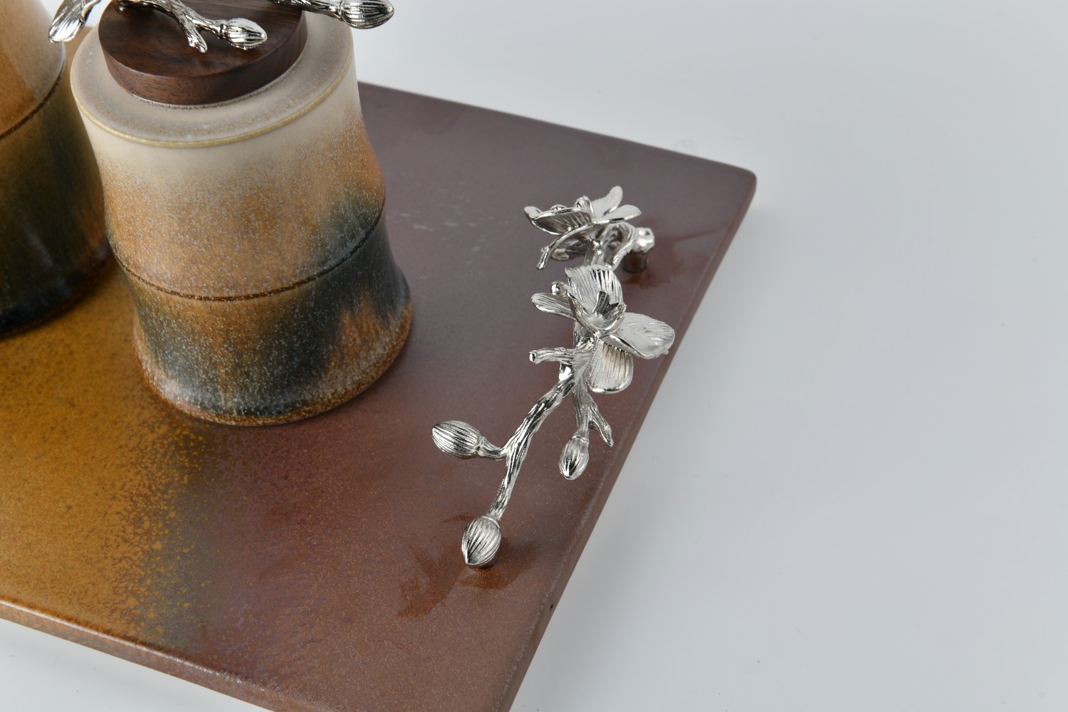 This pair of ceramic storage jars with a tray integrates storage function with decorative aesthetics. The jar body inherits the warm brown ceramic gradient texture of the collection, and its smooth touch exudes a soothing ambiance; the silver metal flower branch decorations on the jar lid and tray edge have delicate textures like clusters of flowers blooming on branches, interpreting the integrated style of new Chinese and light luxury. The integrated tray design not only makes storage more neat but also turns this set into a "visual highlight" for the living room coffee table or dining room storage area — it can store small items such as candies and tea bags, while enhancing the space's elegance with exquisite details.