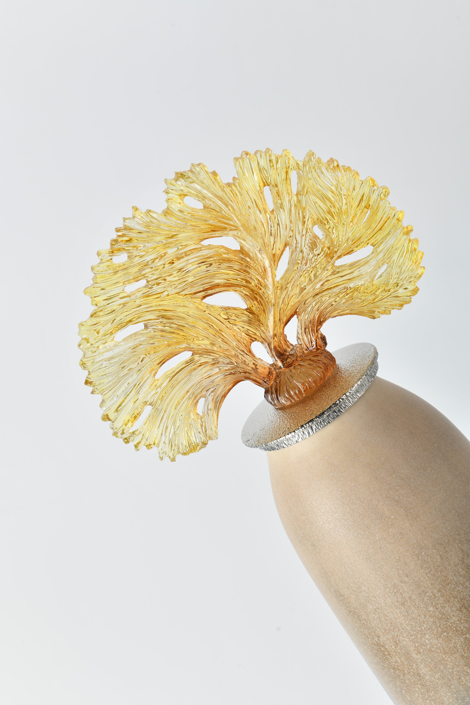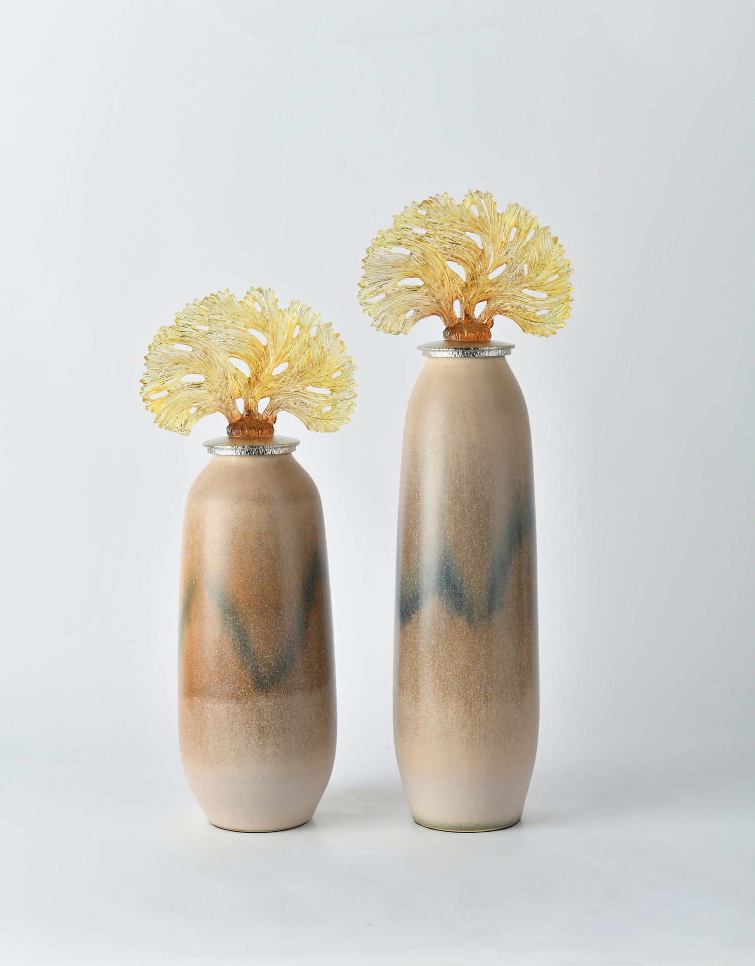 This pair of warm brown ceramic vases is made of matte ceramic, with gradient textures of warm brown and dark brown blending on the surface, resembling the natural texture of the autumn earth, boasting a warm and gentle touch. The golden resin coral-shaped decoration on the top is particularly eye-catching: the translucent resin material restores the vivid form of coral, paired with the silver metal ring accent at the mouth of the vase, skillfully combining natural charm with light luxury texture.