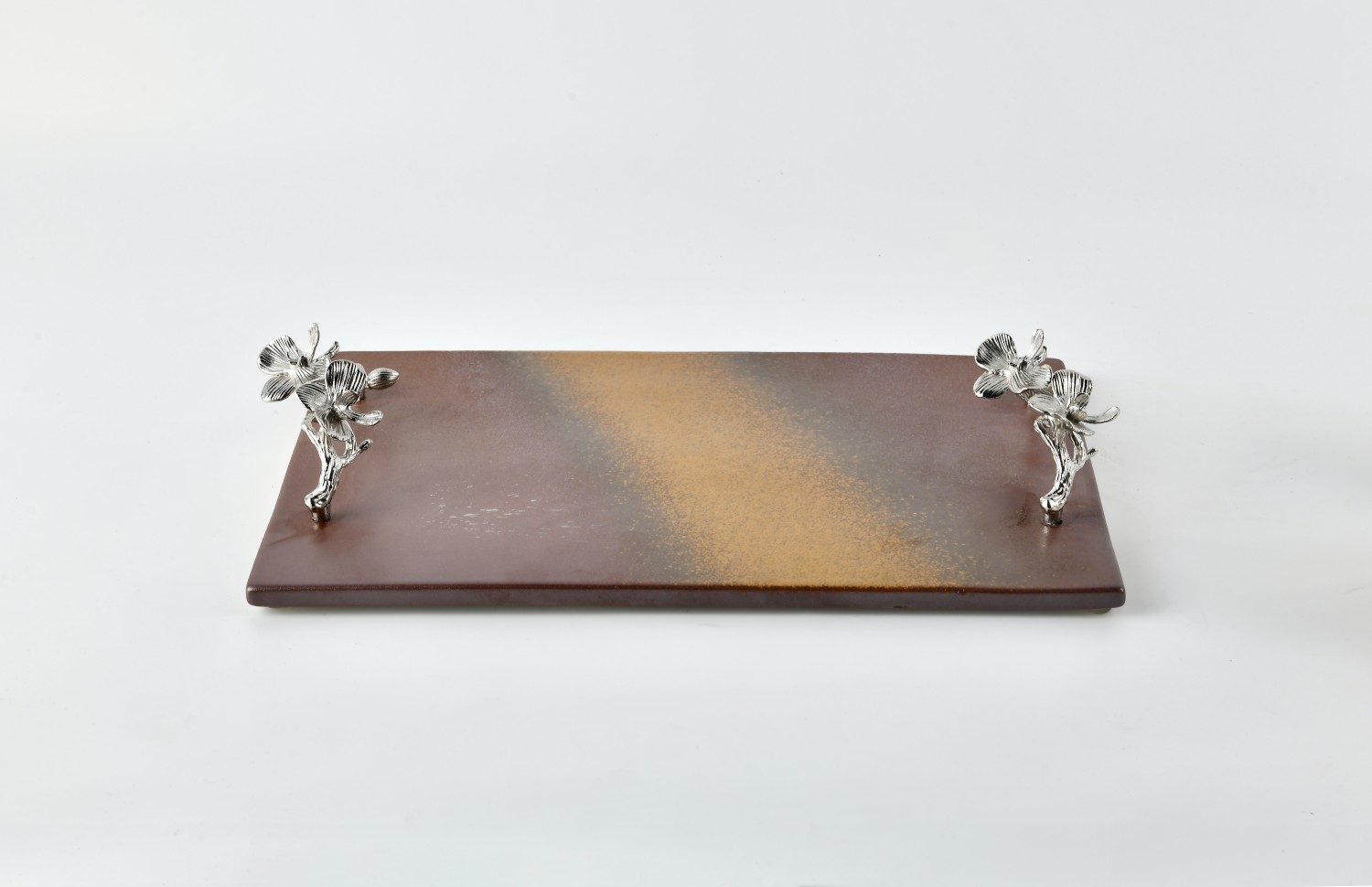 This ceramic tray is based on brown gradient ceramic, with a matte texture that exudes understated elegance; the silver orchid-shaped metal decorations on both sides of the tray feature vibrant lines and exquisite details, like orchids quietly resting on the edge of the tray, infusing artistic charm into practical utensils. Whether holding soft furnishings such as tea sets and aromatherapy, or serving as a key storage tray at the entrance, it can, through its dual attributes of "practicality + decoration", make daily spaces more exquisite and orderly in a small area.