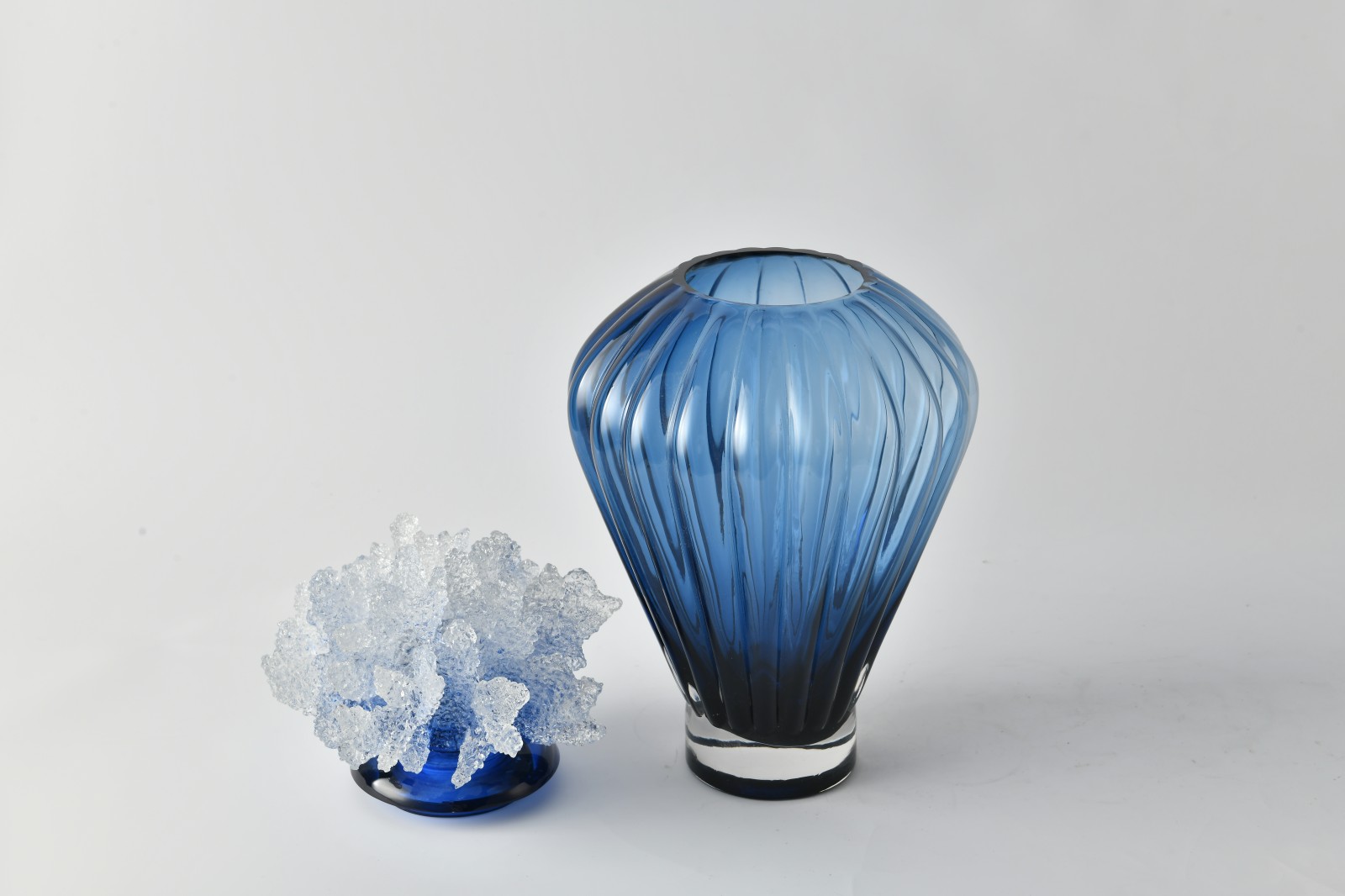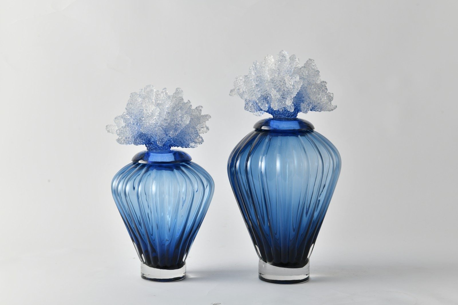 The "Deep Sea Ripples" vases are hand-blown from graduated blue crystal glass, with a design philosophy centered on the ocean's fluidity. The larger vase stands at 38 cm, the smaller at 32 cm, with silhouettes inspired by the elegant curves of Mediterranean seashells. The neck expands naturally into the belly, stabilized by a transparent crystal base, capturing the dynamic beauty of water droplet.