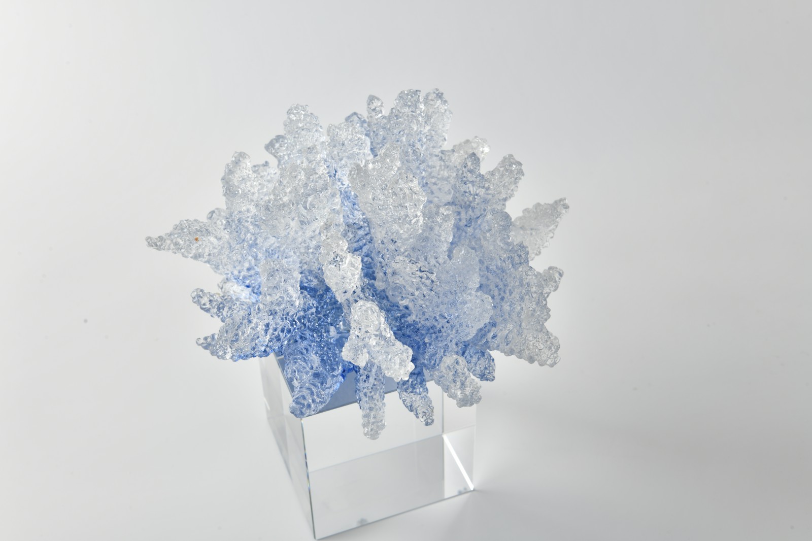 The sculpture is mounted on a transparent crystal base, creating a contrast between the solidity of the base and the translucency of the resin. Drawing on the natural texture of coral and the transparency of resin, the design embodies the vitality of marine ecosystems—coral symbolizing vitality and prosperity, while the mirrored base expands spatial depth through reflection, presenting dynamic beauty in static form.