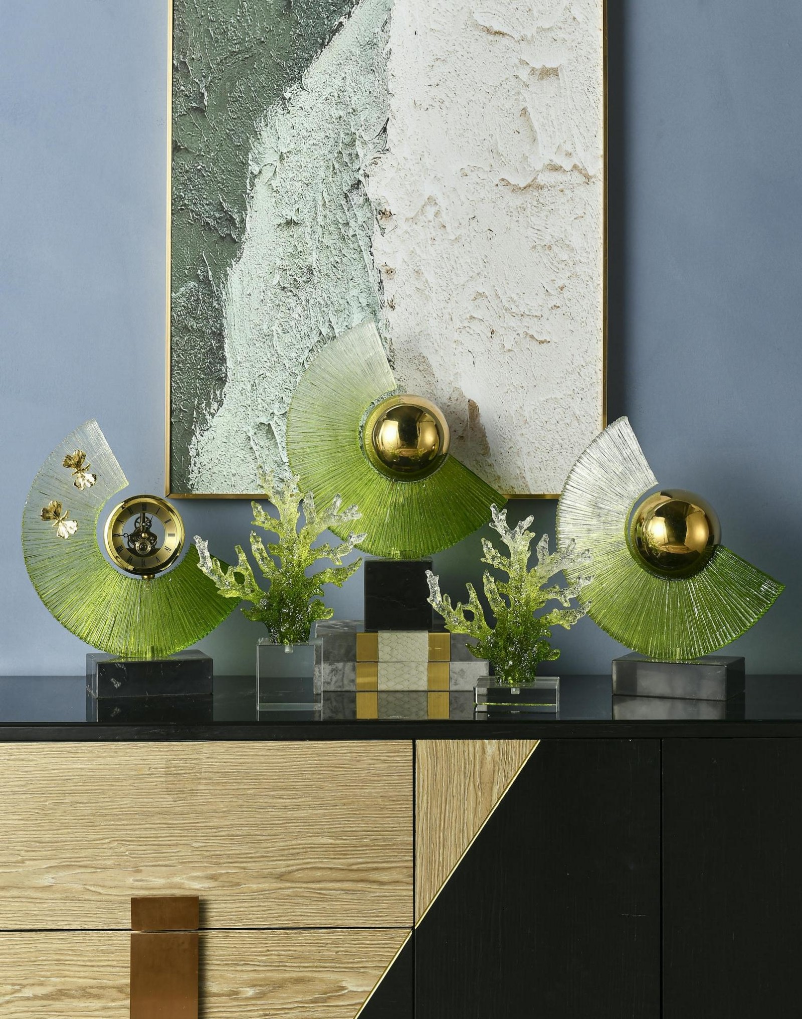 In practical styling, these two sculpture sets demonstrate remarkable versatility. They can be paired with artworks in similar tones and wooden cabinetry on an entry console: the green resin ring sculptures arranged symmetrically, with their gold spheres echoing metallic lines in the artwork; the green resin coral sculptures displayed asymmetrically to create height variation and visual depth. The transparent bases reflect surrounding surfaces, enhancing the sense of openness.