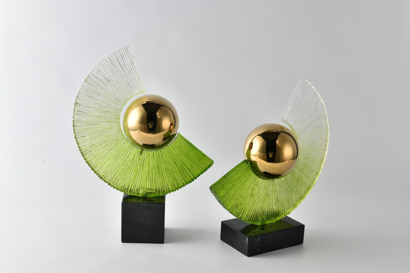 When placed in a real setting, light passes through the resin panels as the golden sphere reflects a warm halo. The contrast between the gradient green and the black base creates a compelling visual statement. Displayed on a console or side table in an entryway or living room, the sculptures resemble two fresh green leaves embracing hope, infusing the space with vitality and artistic elegance.