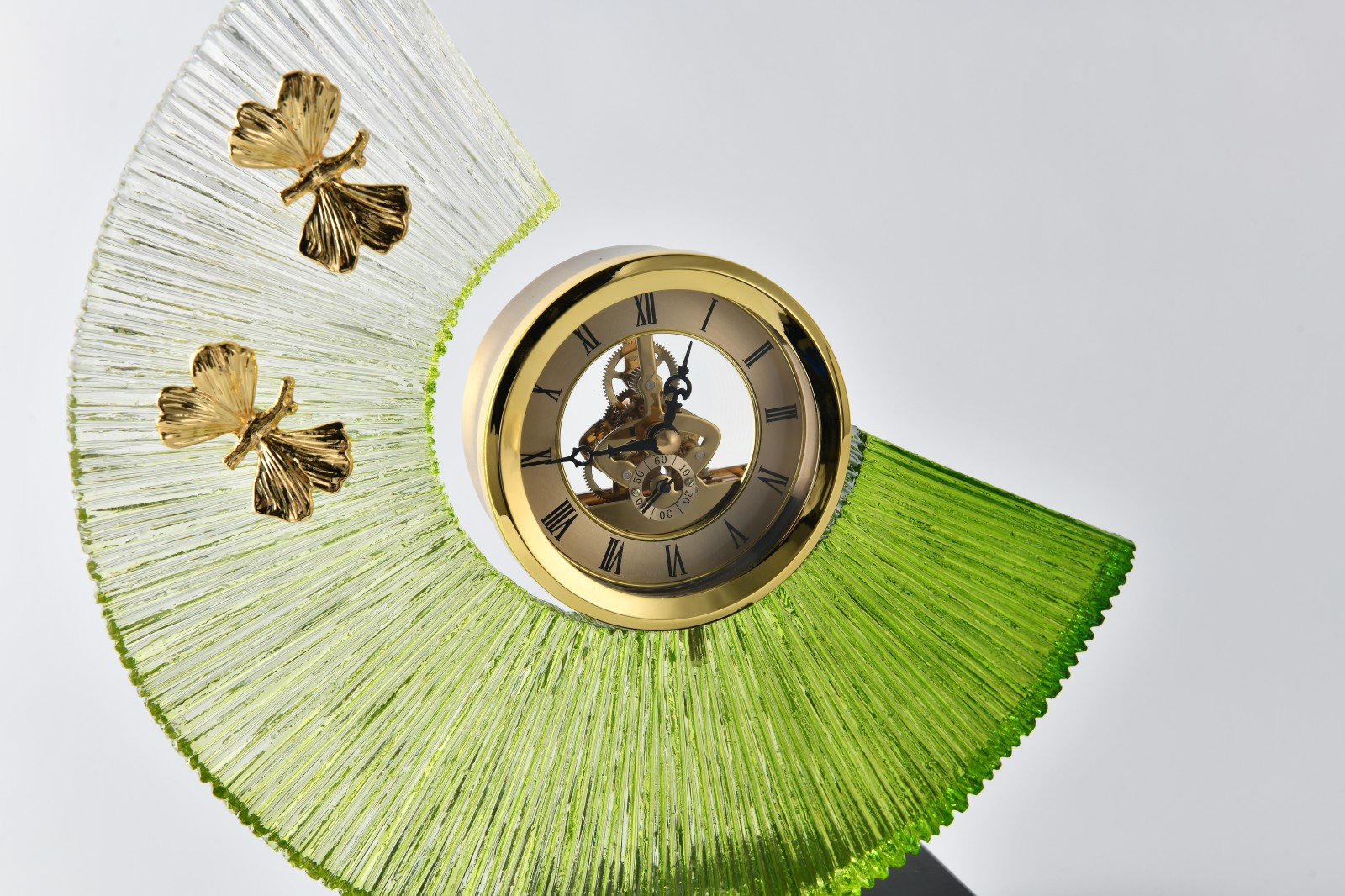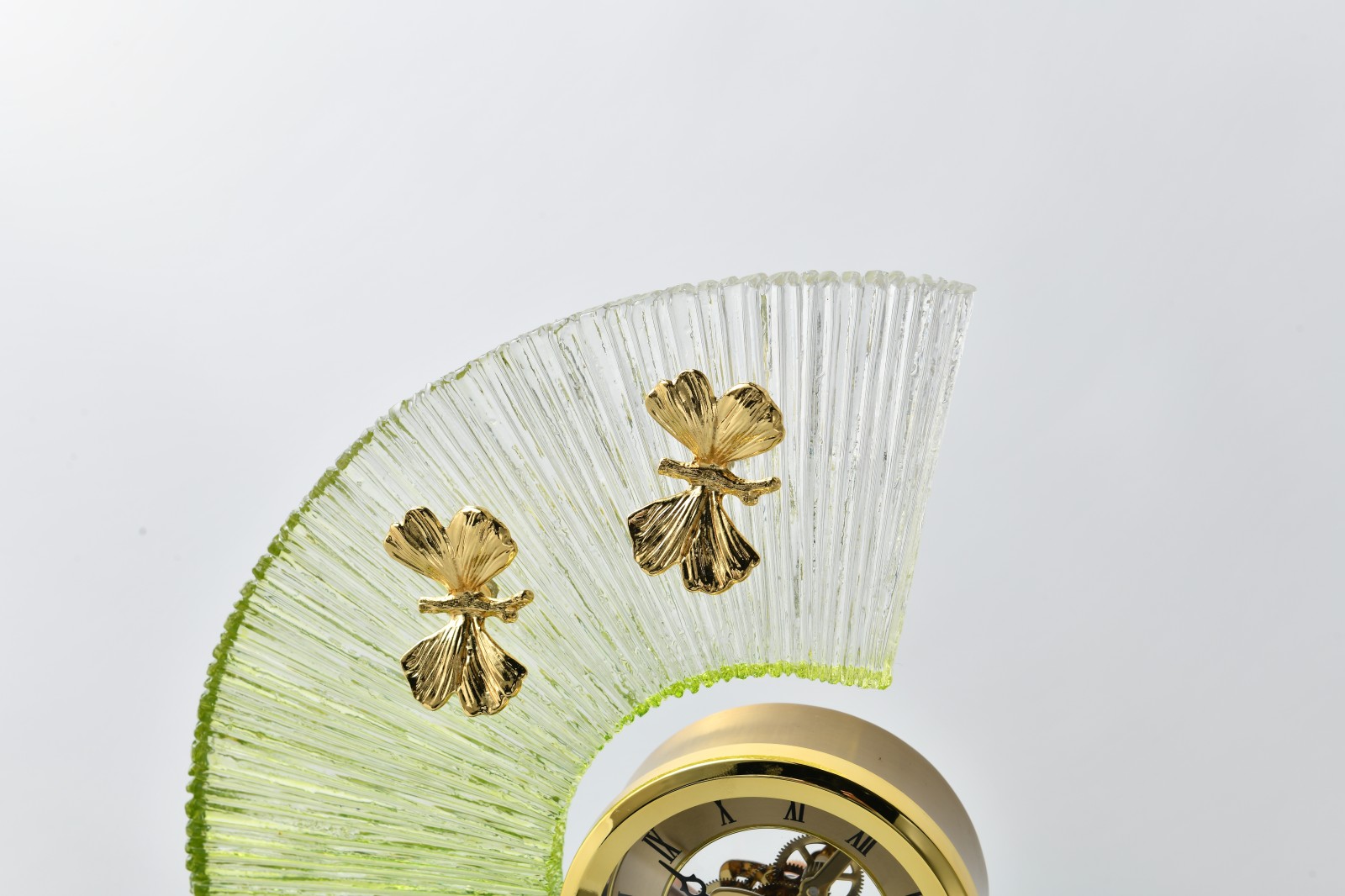 The focal point is a gold-toned alloy sphere set at the center, electroplated to achieve a radiant sheen reminiscent of morning dew catching the sunlight. Subtle traces of hand polishing reveal the artisans’ meticulous craftsmanship. The resin panels feature a gradient green finish—transitioning naturally from deep green at the base to a lighter green at the edges—echoing the layered growth of plant leaves. Vertical textures, inspired by leaf veins, are formed through a combination of mold pressing and hand finishing, bringing each line vividly to life.