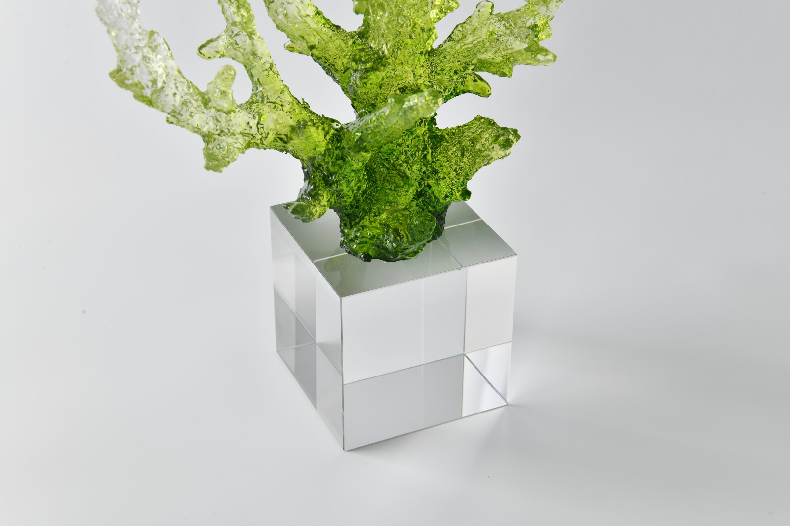 Through a blend of hand carving and mold shaping, the designers preserve the organic randomness of coral growth—some branches reach upward, others spread laterally—evoking the gentle sway of coral in ocean currents. Each sculpture rests on a transparent acrylic cube base, creating a contrast between solidity and transparency. The mirrored reflections and shifting light lend the pieces a dynamic quality, as if a miniature underwater world has been brought into the home.