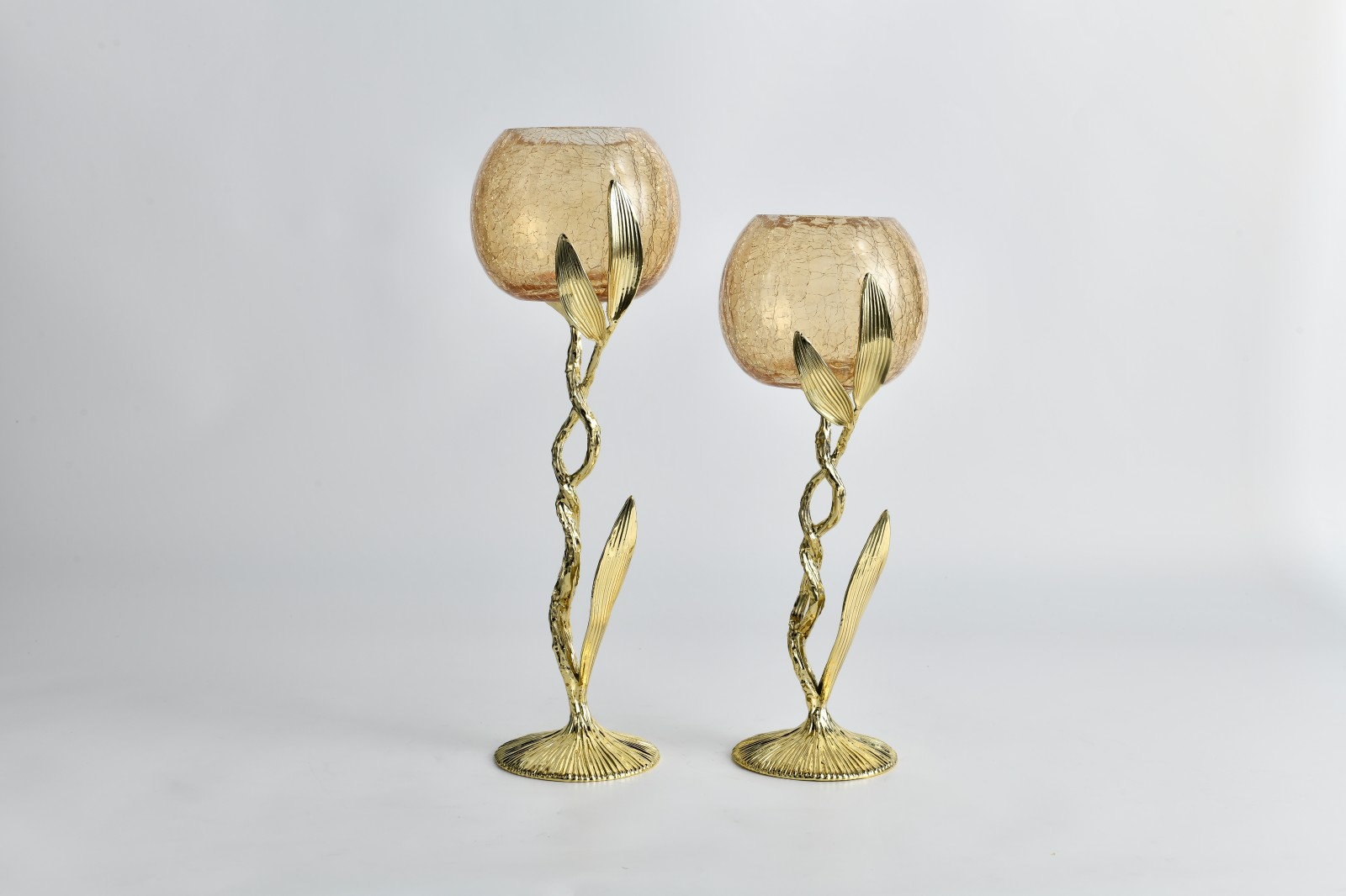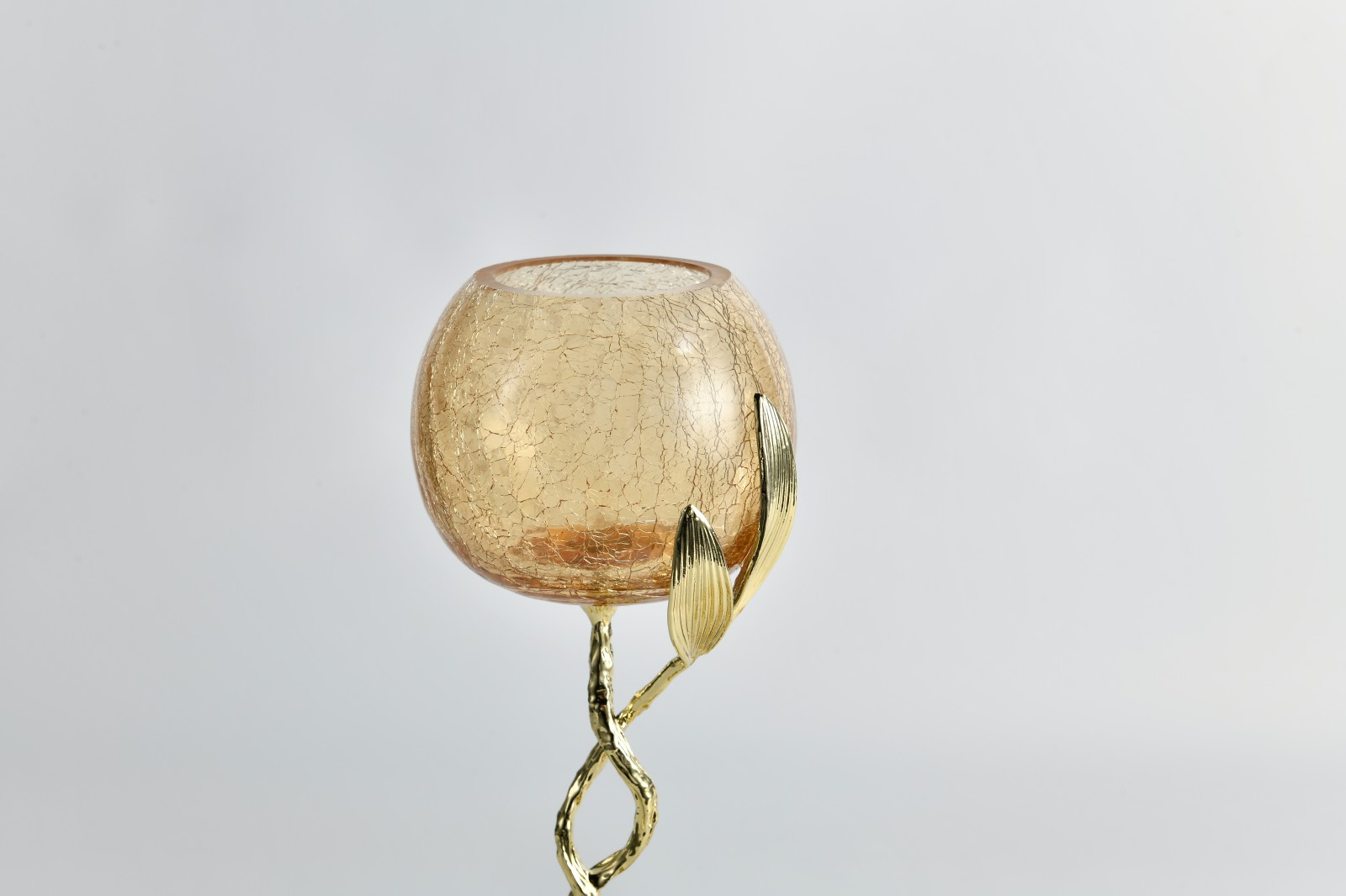 Lit, candlelight filters through the golden branches, casting dappled shadows reminiscent of moonlight through a forest. Unlit, the candle holders stand as sculptural objects, echoing the golden tones of the glass fruit baskets and vases. Whether on a dining table or side console, they add ritual, warmth, and artistic presence to any setting.