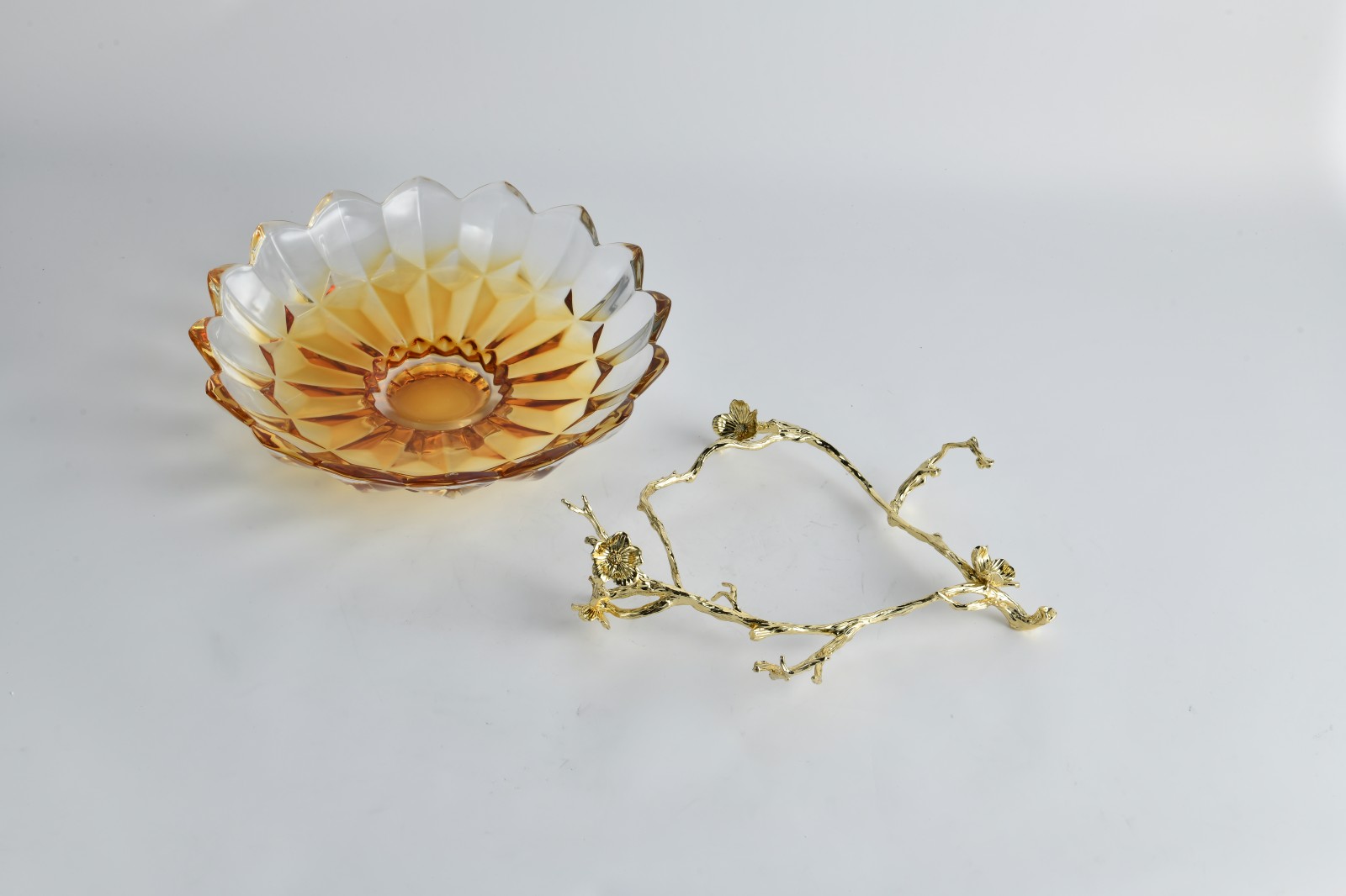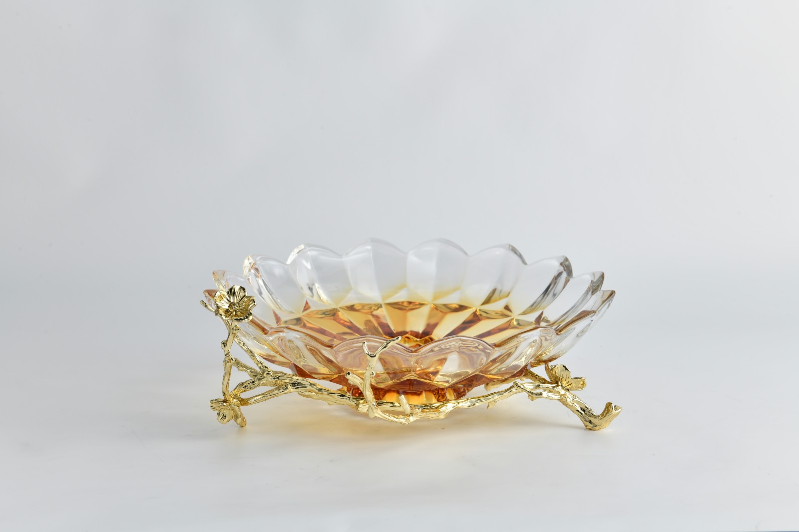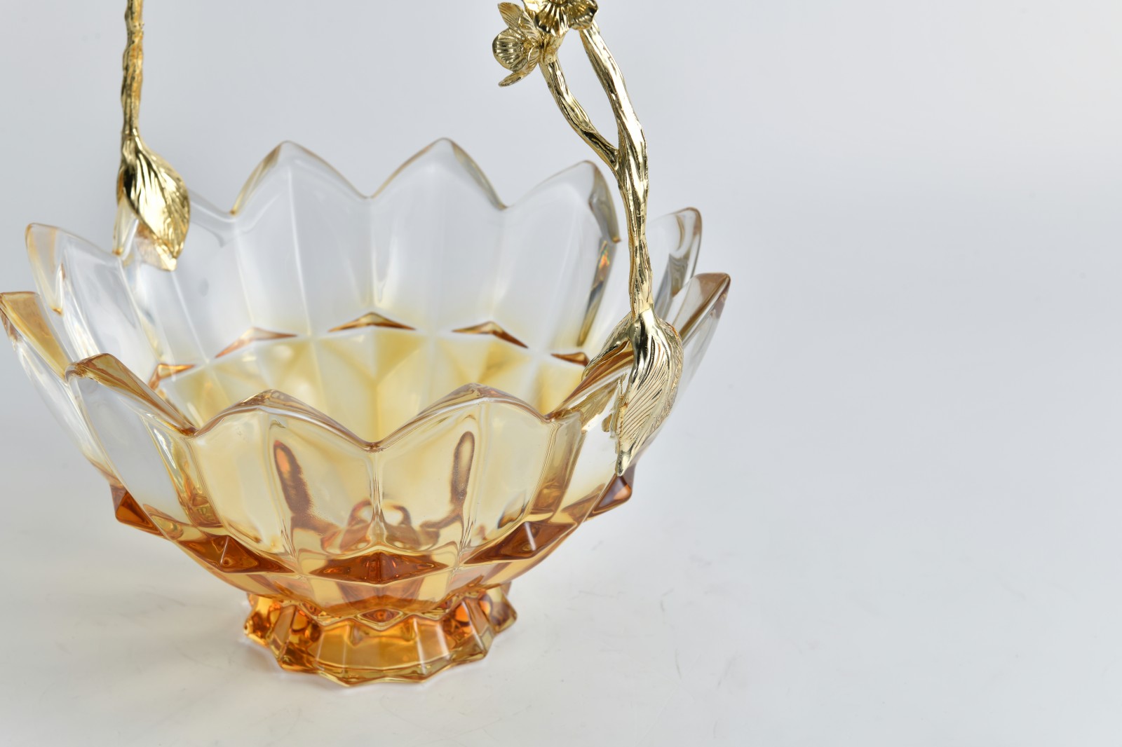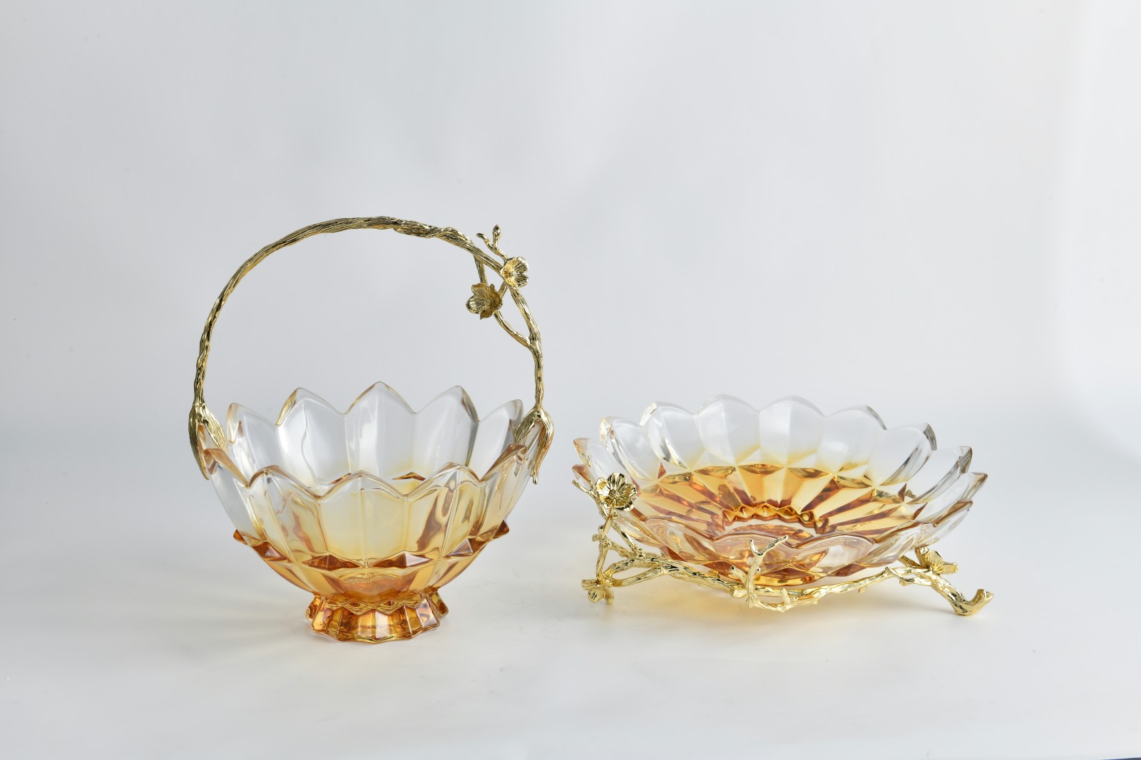 Inspired by the concept of “golden petals holding morning dew,” this pair of golden glass fruit baskets seamlessly combines everyday practicality with artistic expression. Each basket is hand-blown from high–borosilicate glass, featuring lotus-petal–shaped edges with soft, organic curves reminiscent of newly unfurled leaves. A polished golden alloy base provides stability, creating a refined contrast between metallic brilliance and glass transparency.