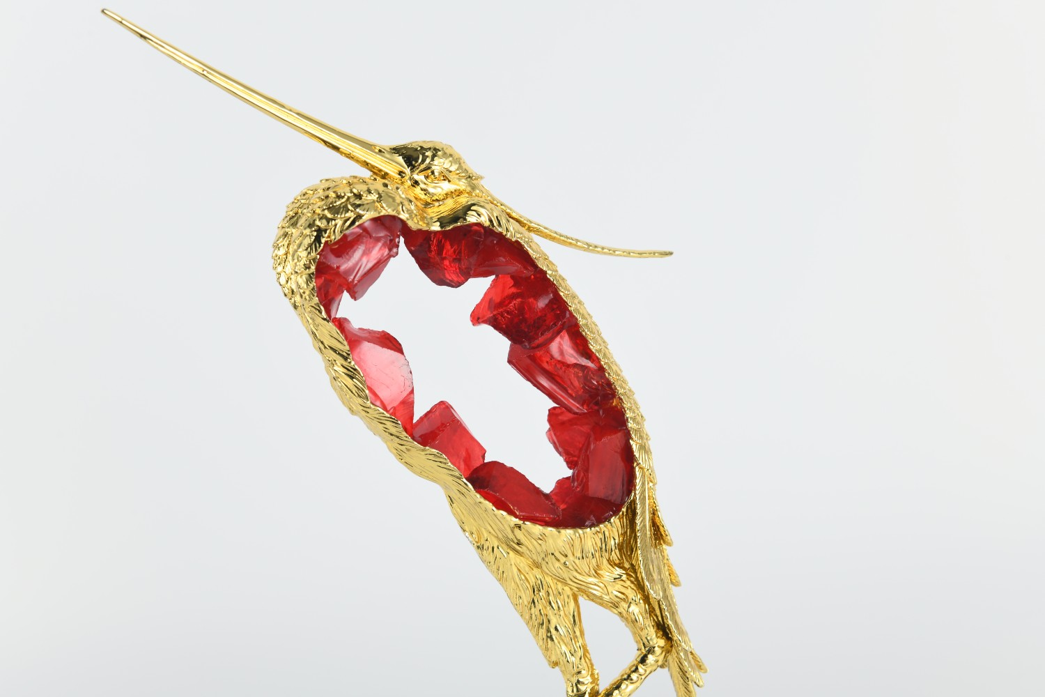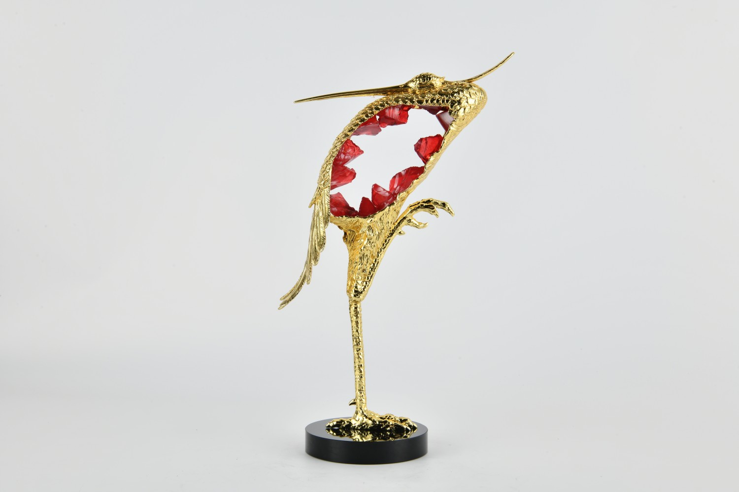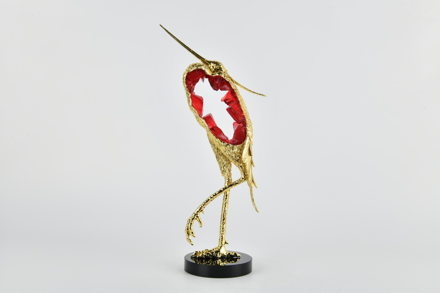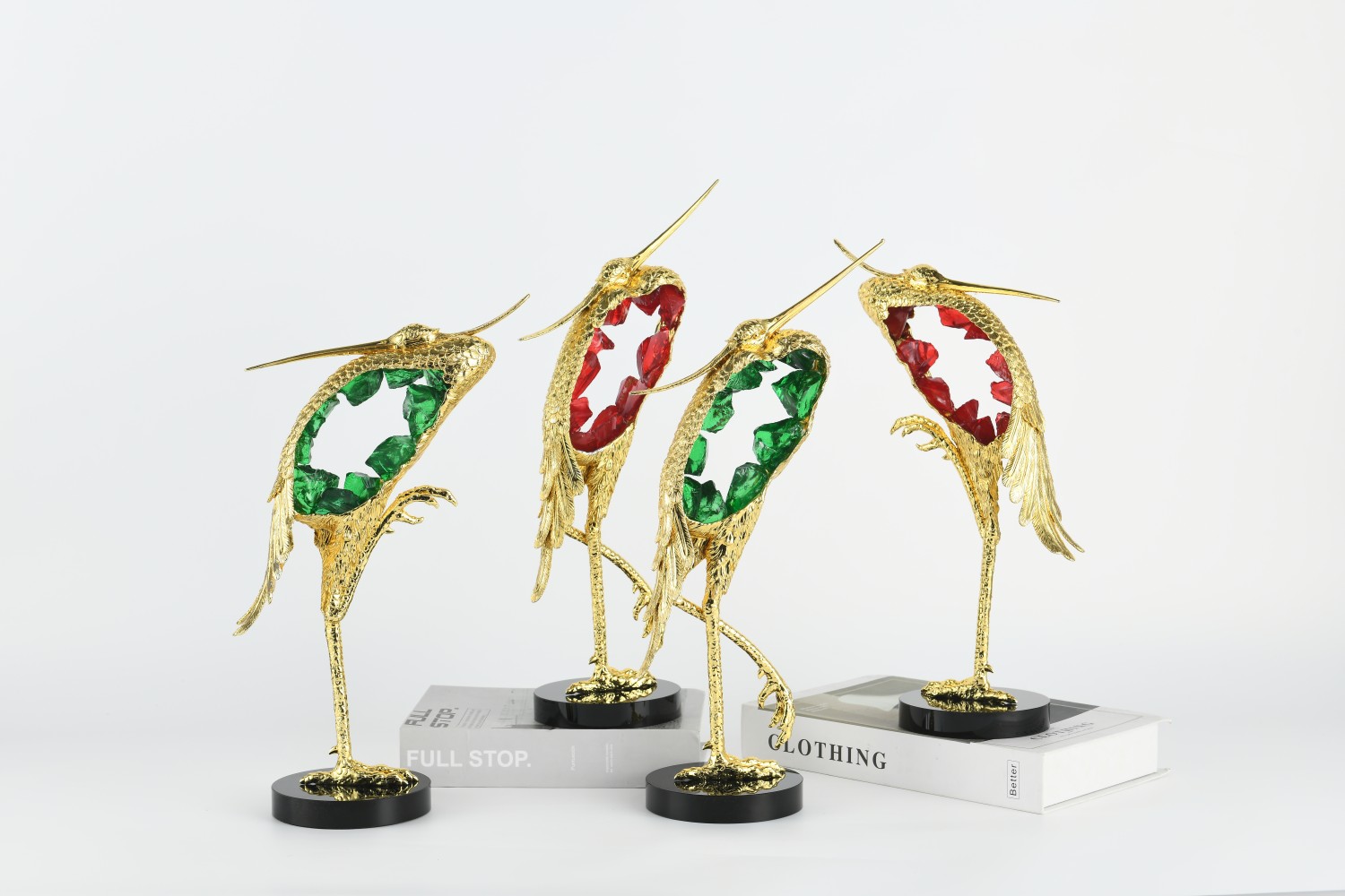A striking highlight is the colorful inlay on the egret’s abdomen: green and red crystal elements evoke the look of jade and ruby. Each crystal is carefully hand-set and polished, achieving a harmonious “gold-and-jewel” visual effect. The larger sculpture stands 40 cm tall, the smaller 30 cm, both anchored on matte-finished black crystal bases that contrast beautifully with the gold finish while enhancing stability.