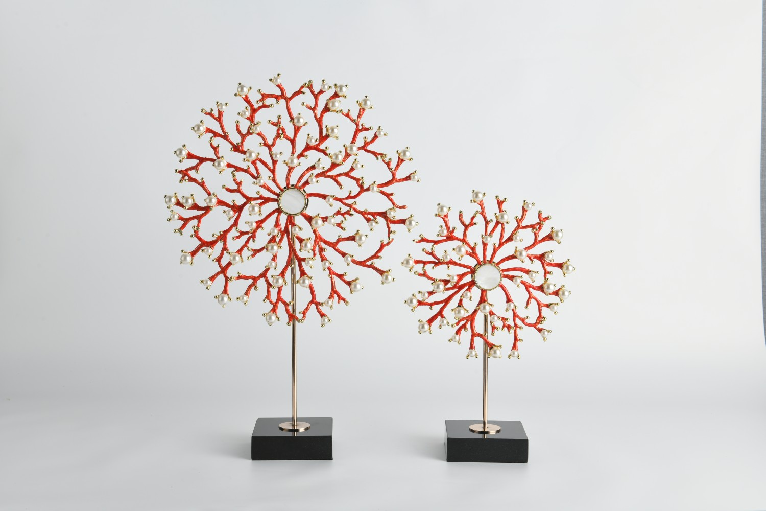 Inspired by the theme “Crimson Coral Pearl Tree,” this pair of red circular coral sculptures uses a combination of resin and metal to recreate the organic forms of coral reefs. The overall shape is a radiant circle, with branches extending evenly from the center. A red baked enamel finish gives the surface a coppery, sunset-like sheen.
