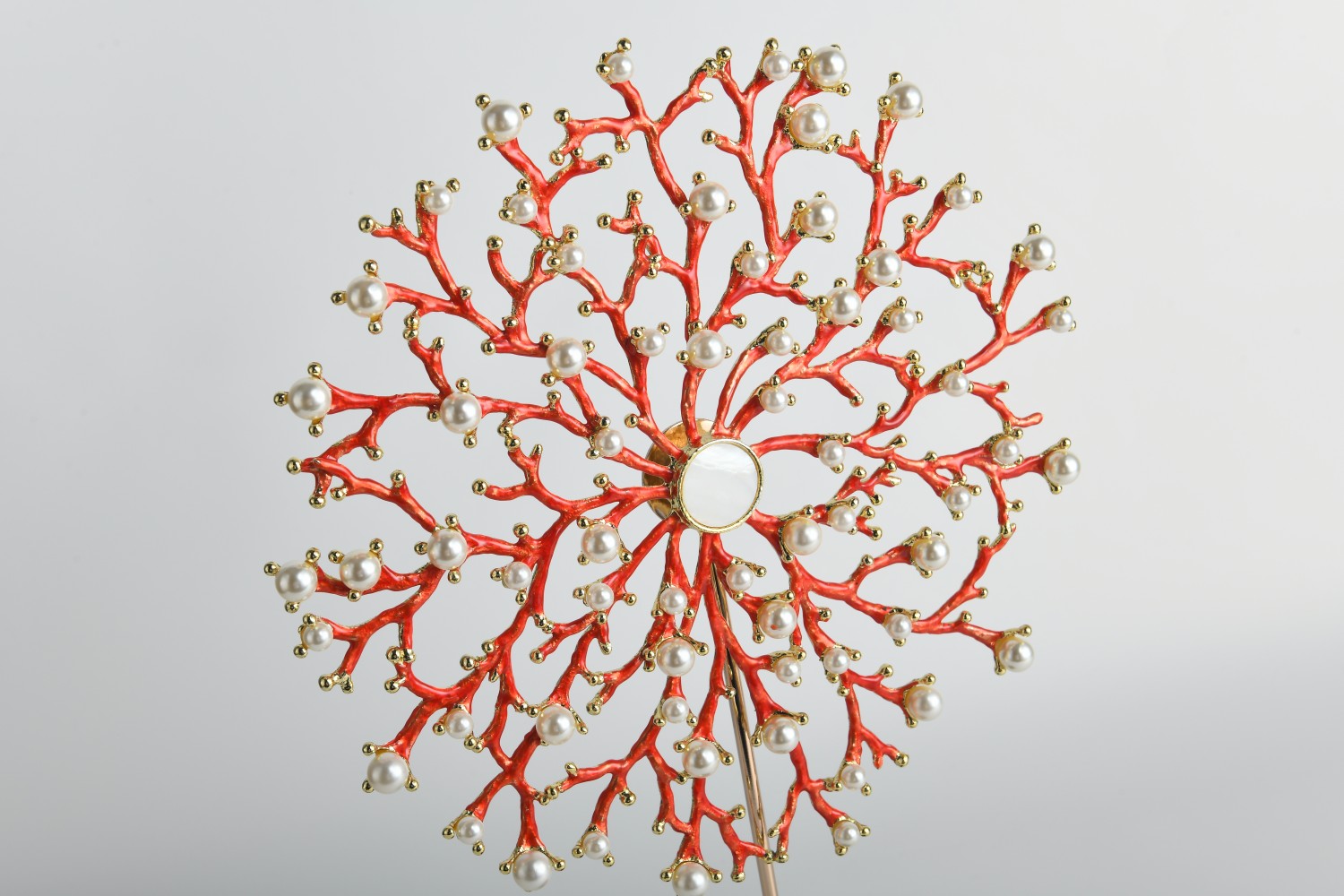 Each branch tip is adorned with a hand-set white pearl approximately 10 mm in diameter, secured with metal prongs to resemble coral polyps. This detailing adds depth and refinement. At the center, a polished natural shell disc displays an iridescent luster, contrasting elegantly with the red coral branches and white pearls.