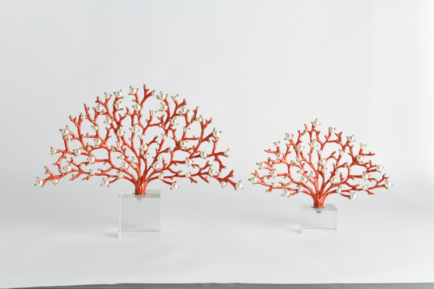 The base combines a gold alloy column with a black marble platform. The high-polish gold finish contrasts with the coral’s matte red surface, while the marble base ensures stability. The larger sculpture measures 31 cm in diameter, and the smaller 22 cm.