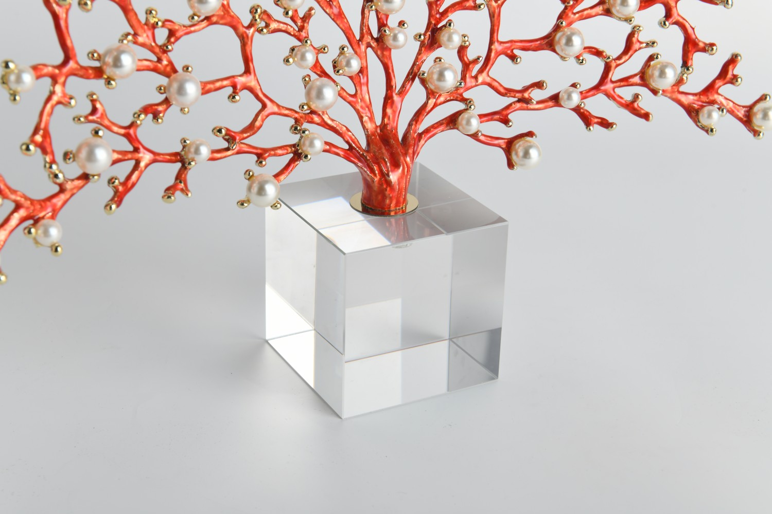Hand-inlaid white pearls are evenly distributed along the branch tips—approximately 30% fewer than in the circular version—creating a more airy, refined aesthetic. The base is a 5 cm thick transparent acrylic block with a non-slip finish, offering a clean, modern contrast to the vivid red coral while protecting surfaces.