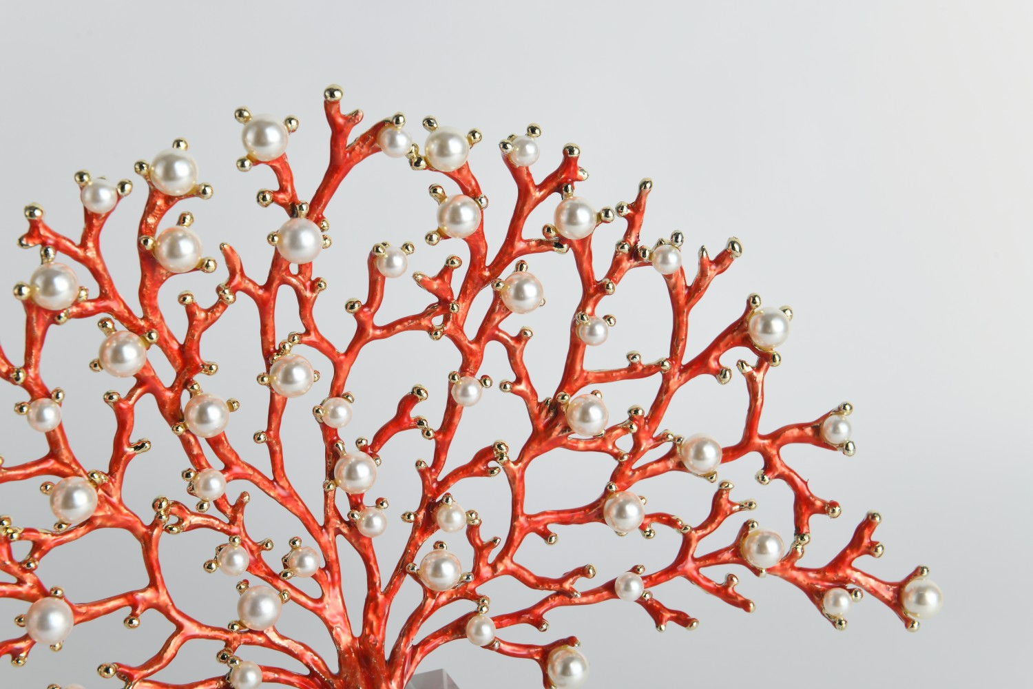 Displayed on a TV console, sideboard, or bedside table, the pearls softly reflect light and the shell center shimmers with iridescent tones—bringing the vitality of a crimson coral reef into the home.